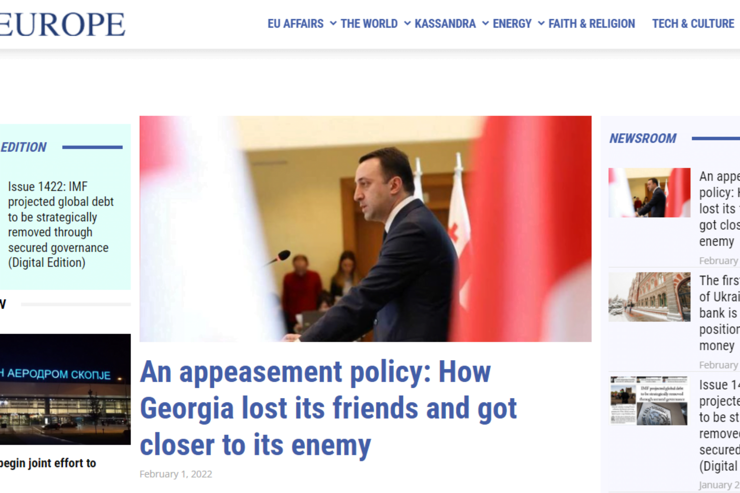 New Europe, the leading EU affairs newspaper, published an article titled “An appeasement policy: How Georgia lost its friends and got closer to its enemy.” The article’s author is Teona Zurabashvili, Junior policy analyst at the Georgian Institute of Politics (GIP).