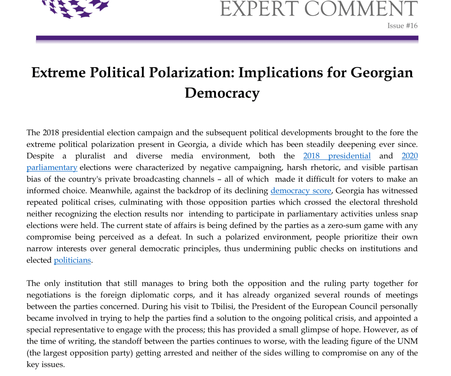 Uncategorized 29 Mar 2021 Extreme Political Polarization: Implications for Georgian DemocracyExpert Comment #16 | March, 2021 GIP