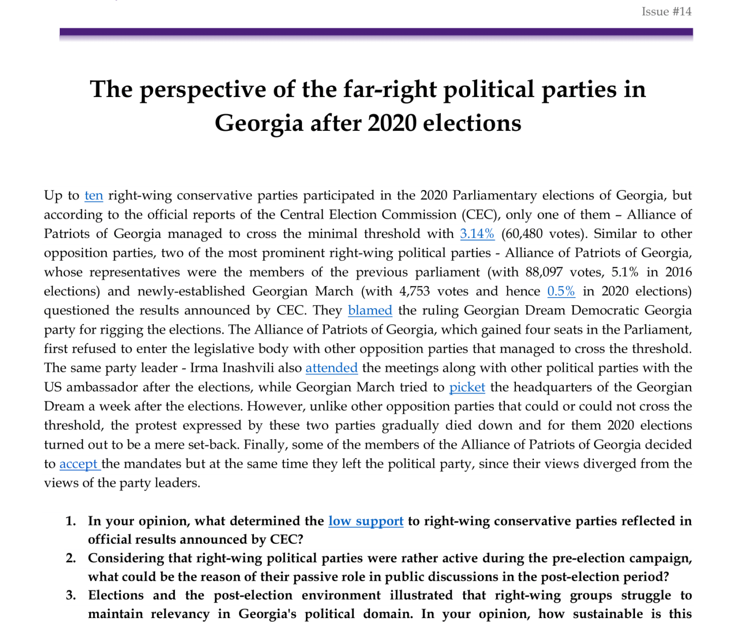 Uncategorized 29 Jan 2021 The Perspective of the Far-right Political Parties in Georgia after 2020 ElectionsExpert Comment #14 | January, 2021 GIP