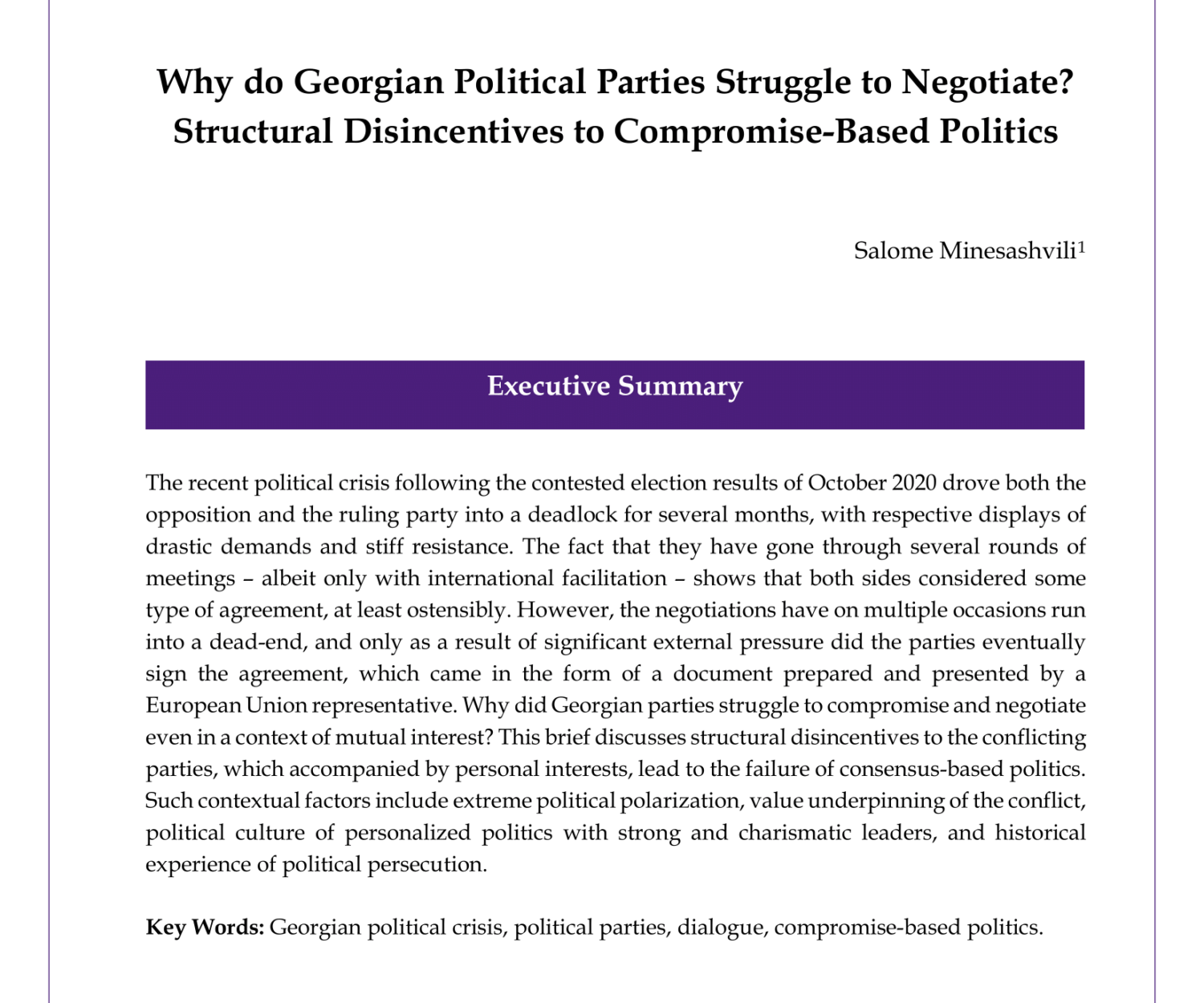 Uncategorized 12 May 2021 Why do Georgian Political Parties Struggle to Negotiate? Structural Disincentives to Compromise-Based PoliticsThe recent political crisis following the contested election results of October 2020… Salome Minesashvili