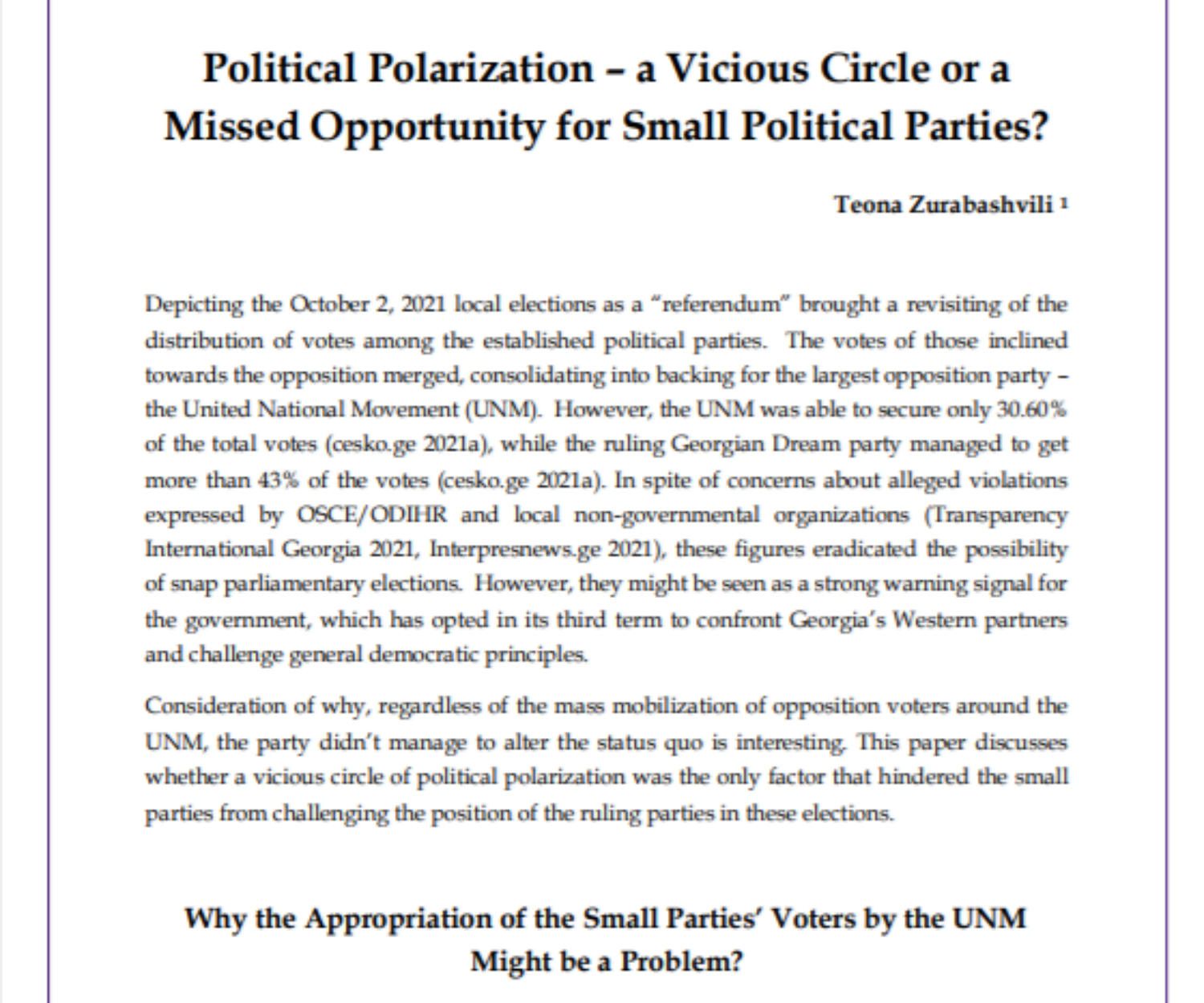 Uncategorized 29 Oct 2021 Political Polarization – a Vicious Circle or a Missed Opportunity for Small Political Parties?It can be assumed that in the local elections of October 2… Teona Zurabashvili
