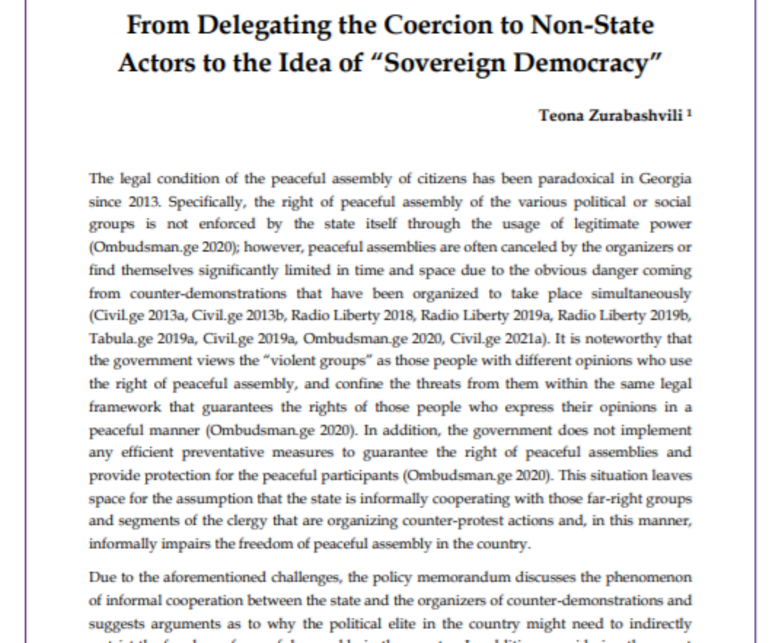 Uncategorized 25 Nov 2021 From Delegating the Coercion to Non-State Actors to the Idea of “Sovereign Democracy”The legal condition of the peaceful assembly of citizens has been paradoxical… Teona Zurabashvili