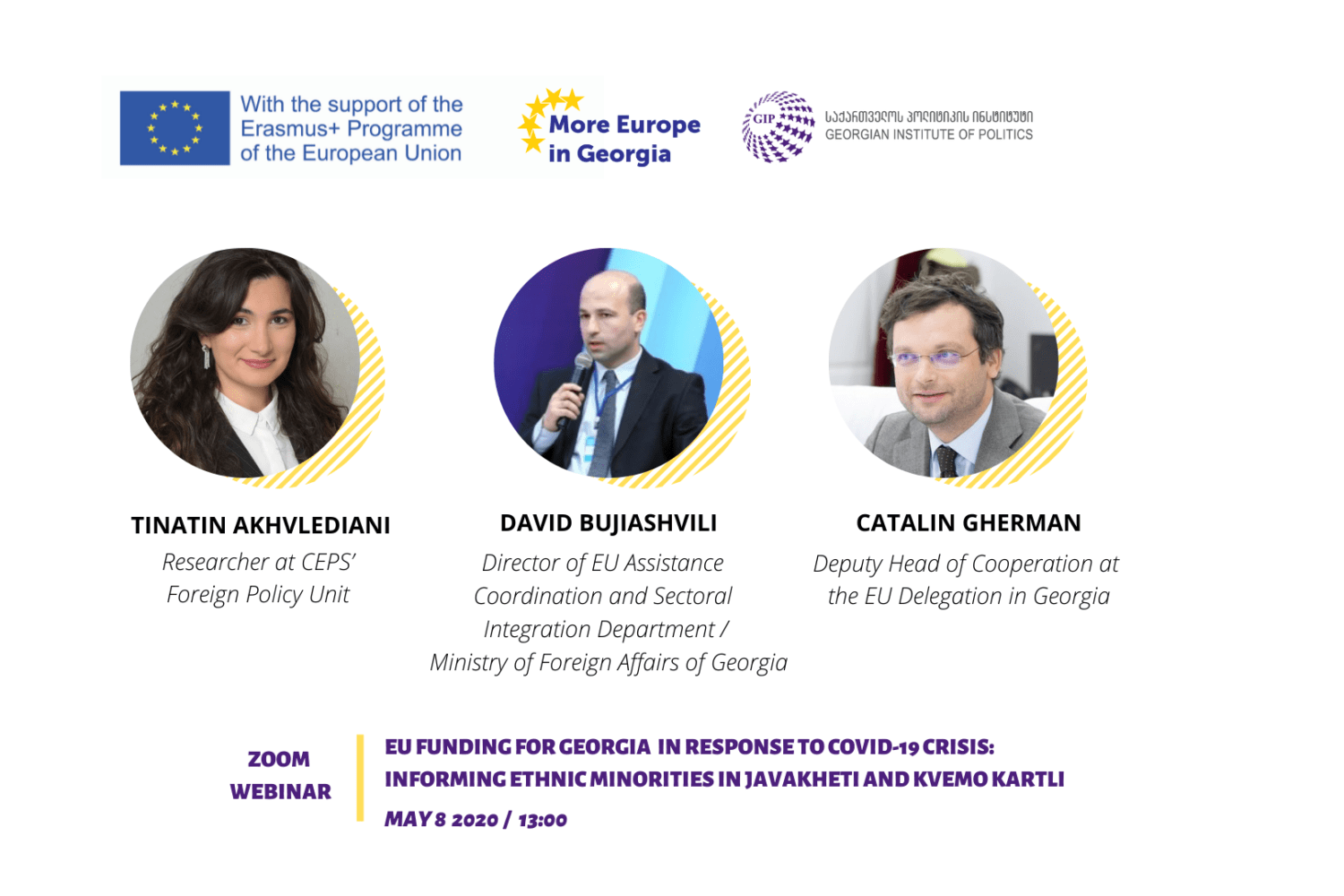 On May 8, the Georgian Institute of Politics (GIP) will organize a Zoom Webinar discussion about EU funding provided for Georgia in fighting against the Covid-19 crisis. The Webinar will target ethnic minority groups in the regions of Kvemo Kartli and Samtskhe-Javakheti. The event is planned within the framework of the ongoing Erasmus+ Jean Monnet project “Promote and Act for Europe”, which is financially supported by the European Union. The project aims at promoting discussion and reflection about the EU among one of the most vulnerable and excluded groups in Georgia, namely Armenian and Azerbaijani ethnic and religious minorities. The purpose of organizing this discussion is to raise their awareness about the benefits of European integration of Georgia and to inform them about the equality of their position regarding their rights and opportunities given by the EU. Therefore, the discussion targets specifically ethnic minorities in Georgia, members of which have faced tremendous economic damage in the conditions of the lock-down.