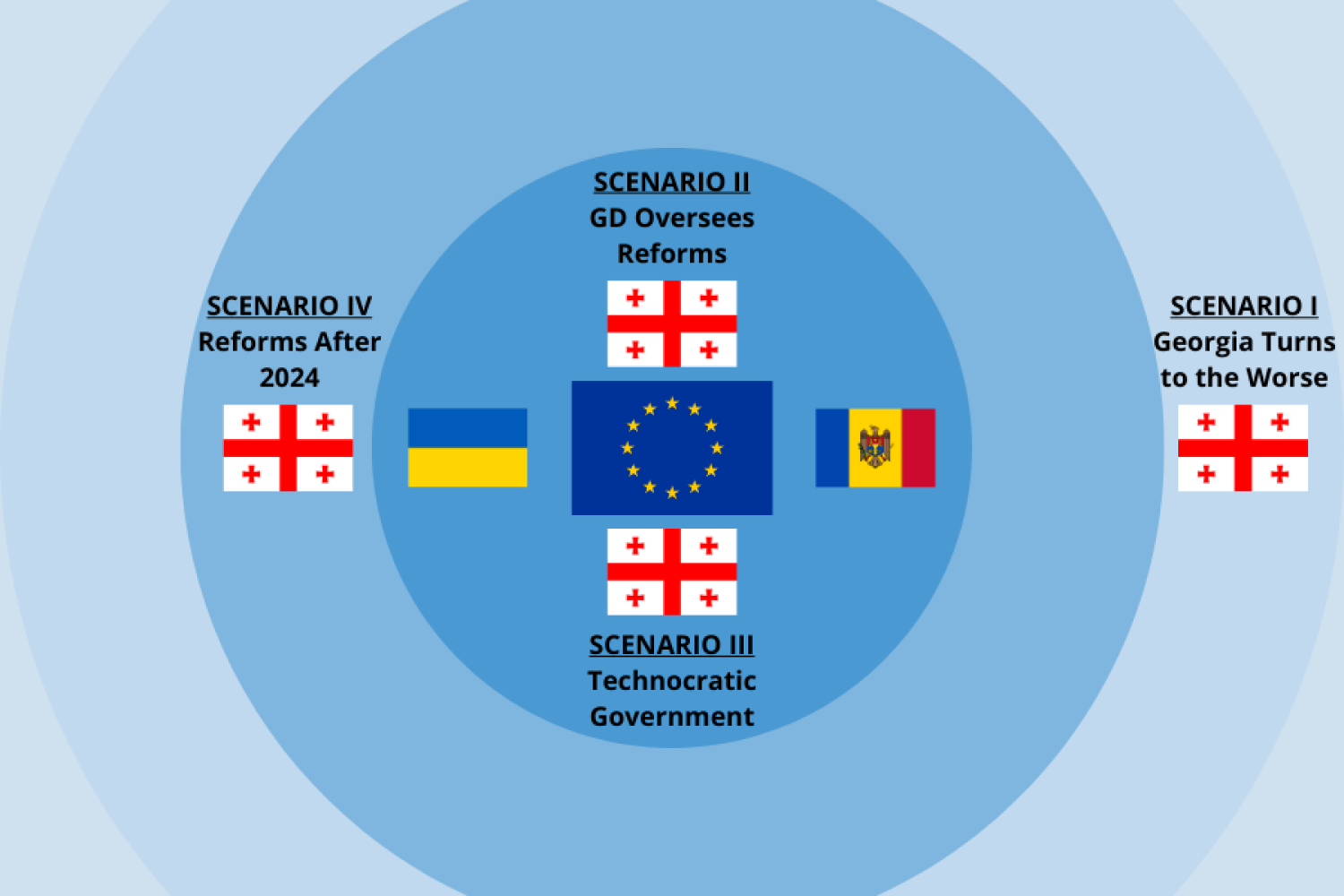In conclusion, this scenario is less optimistic that the current Georgian government will successfully carry out reforms by the December deadline. Rather, it forsees a series of events in which the country prepares for the 2024 parliamentary elections to ensure that the political field remains less polarized and more open for cooperation-based politics. The incumbent government also needs to engage in a good-faith dialogue with multiple political forces, civil society representatives, and business leaders while designing and implementing key reforms.