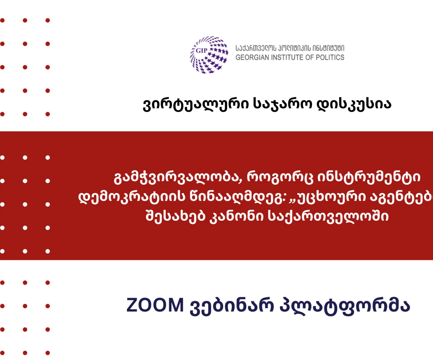 სიახლეები 15 აპრ 2024 გამჭვირვალობა, როგორც ინსტრუმენტი დემოკრატიის წინააღმდეგ: „უცხოური აგენტების“ შესახებ კანონი საქართველოშისაქართველოს პოლიტიკის ინსტიტუტმა 10 აპრილს მოაწყო ვირტუალური საჯარო დისკუსია სახელწოდებით - „გამჭვირვალობა,… GIP