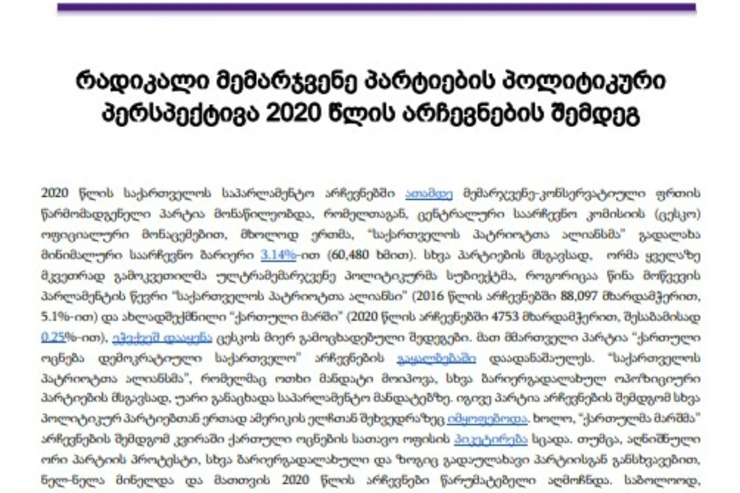 2020 წლის საქართველოს საპარლამენტო არჩევნებში ათამდე მემარჯვენე-კონსერვატიული ფრთის წარმომადგენელი პარტია მონაწილეობდა, რომელთაგან, ცენტრალური საარჩევნო კომისიის (ცესკო) ოფიციალური მონაცემებით, მხოლოდ ერთმა, “საქართველოს პატრიოტთა ალიანსმა” გადალახა მინიმალური საარჩევნო ბარიერი 3.14%–ით (60,480 ხმით). სხვა პარტიების მსგავსად, ორმა ყველაზე მკვეთრად გამოკვეთილმა ულტრამემარჯვენე პოლიტიკურმა სუბიექტმა, როგორიცაა წინა მოწვევის პარლამენტის წევრი “საქართველოს პატრიოტთა ალიანსი” (2016 წლის არჩევნებში 88,097 მხარდამჭერით, 5.1%-ით) და ახლადშექმნილი “ქართული მარში” (2020 წლის არჩევნებში 4753 მხარდამჭერით, შესაბამისად 0.25%-ით), ეჭვქვეშ დააყენა ცესკოს მიერ გამოცხადებული შედეგები. მათ მმართველი პარტია “ქართული ოცნება დემოკრატიული საქართველო” არჩევნების გაყალბებაში დაადანაშაულეს. “საქართველოს პატრიოტთა ალიანსმა”, რომელმაც ოთხი მანდატი მოიპოვა, სხვა ბარიერგადალახულ ოპოზიციური პარტიების მსგავსად, უარი განაცხადა საპარლამენტო მანდატებზე. იგივე პარტია არჩევნების შემდგომ სხვა პოლიტიკურ პარტიებთან ერთად ამერიკის ელჩთან შეხვედრაზეც იმყოფებოდა. ხოლო, “ქართულმა მარშმა” არჩევნების შემდგომ კვირაში ქართული ოცნების სათავო ოფისის პიკეტირება სცადა. თუმცა, აღნიშნული ორი პარტიის პროტესტი, სხვა ბარიერგადალახული და ზოგიც გადაულახავი პარტიისგან განსხვავებით, ნელ-ნელა მინელდა და მათთვის 2020 წლის არჩევნები წარუმატებელი აღმოჩნდა. საბოლოოდ, “საქართველოს პატრიოტთა ალიანსის” ზოგიერთმა წევრმა მიიღო პარლამენტში შესვლის გადაწყვეტილება, თუმცა ამავდროულად მათ პარტიის დატოვება მოუწიათ, რადგან მათი და პარტიის ლიდერების ხედვები ერთმანეთს არ ემთხვევა.