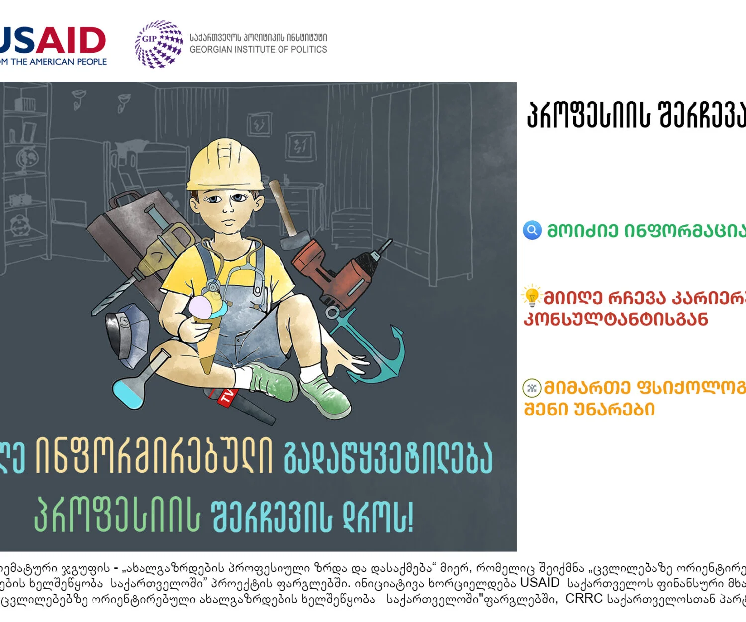 WG ბლოგები 16 ივლ 2021 რატომ უნდა ინტეგრირდეს კარიერის მართვა ზოგადი განათლების სისტემაში?პოლიტიკის დოკუმენტი მომზადდა “ცვლილებებზე ორიენტირებული ახალგაზრდების ხელშეწყობა საქართველოში” პროექტის ფარგლებში შექმნილი სამუშაო… GIP