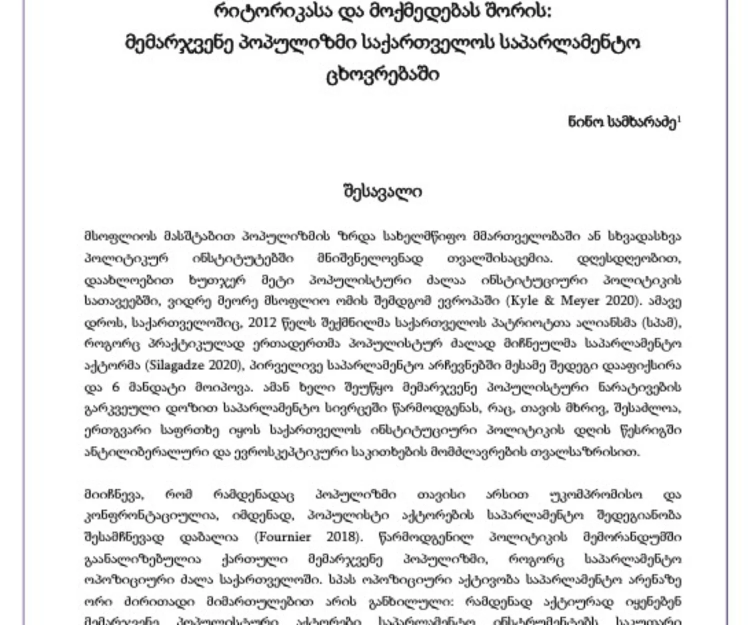 კატეგორიის გარეშე 19 მარ 2021 რიტორიკასა და მოქმედებას შორის: მემარჯვენე პოპულიზმი საქართველოს საპარლამენტო ცხოვრებაშიმსოფლიოს მასშტაბით პოპულიზმის ზრდა სახელმწიფო მმართველობაში ან სხვადასხვა პოლიტიკურ ინსტიტუტებში მნიშვნელოვნად თვალშისაცემია ნინო სამხარაძე, keta