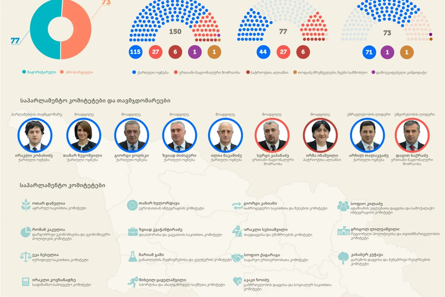 აღნიშნული ინფორმაციის ვიზუალიზაციის მიზნით, საქართველოს პოლიტიკის ინსტიტუტი წარმოგიდგენთ ახალი მოწვევის პარლამენტის ზოგად სტრუქტურას ინფოგრაფიკის სახით.
