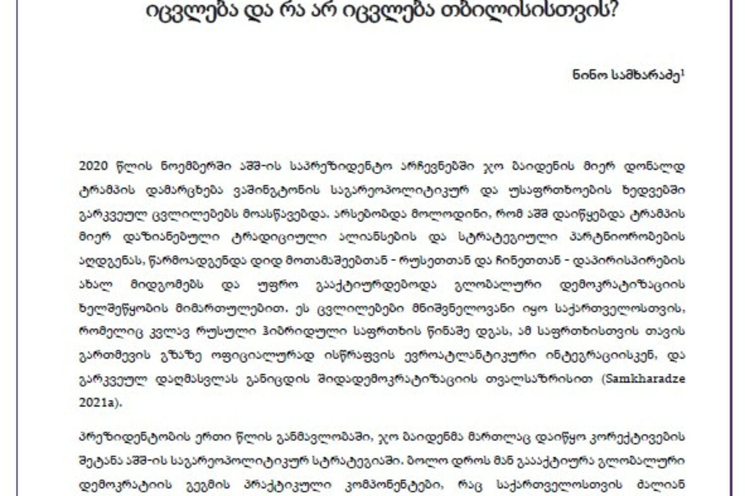 პრეზიდენტობის ერთი წლის განმავლობაში, ჯო ბაიდენმა მართლაც დაიწყო კორექტივების შეტანა აშშ-ის საგარეოპოლიტიკურ სტრატეგიაში. ბოლო დროს მან გაააქტიურა გლობალური დემოკრატიის გეგმის პრაქტიკული კომპონენტები, რაც საქართველოსთვის ძალიან საყურადღებო მოვლენაა. გარდა ამისა, ცხადი გახდა, რომ მიუხედავად რუსეთის წინააღმდეგ საკმაოდ მკაცრი რიტორიკისა, ასეთივე მძაფრი არ არის პრაქტიკული პოლიტიკა, რაც ჩრდილოეთის ნაკადი 2-ის შესახებ აშშ-ის ადმინისტრაციის პოზიციის შეცვლამაც აჩვენა. და ბოლოს, თავდაცვის მიმართულებით, აშშ-საქართველოს ორმხრივი და რეგიონული თანამშრომლობა კვლავ აქტიური და აქტუალურია, თუმცა, საქართველოსთვის საყურადღებოა, რომ ბაიდენის მმართველობის ერთი წლის განმავლობაში, რამდენიმე კონტექსტური გამოწვევა, წარმოიშვა, როგორიცაა ავღანეთის მისიის დასრულება და გართულებული ურთიერთობები თურქეთთან. ამგვარად, ჯო ბაიდენის აშშ-ის პრეზიდენტად არჩევიდან ერთი წლის შემდეგ, მნიშვნელოვანია, შეფასდეს, რა იცვლება და რა არ იცვლება საქართველოსთვის.