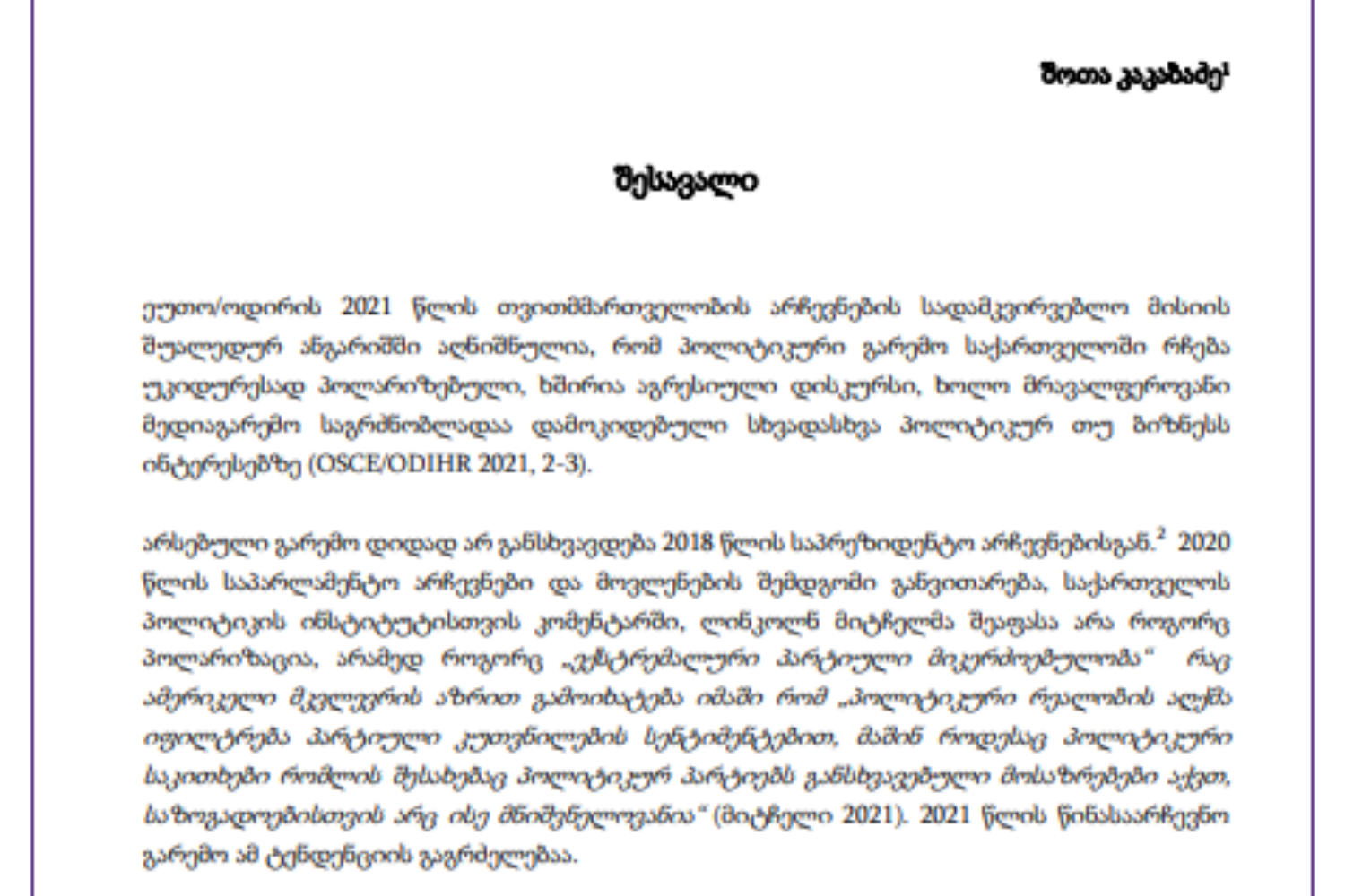 ეუთო/ოდირის 2021 წლის თვითმმართველობის არჩევნების სადამკვირვებლო მისიის შუალედურ ანგარიშში აღნიშნულია, რომ პოლიტიკური გარემო საქართველოში რჩება უკიდურესად პოლარიზებული, ხშირია აგრესიული დისკურსი, ხოლო მრავალფეროვანი მედიაგარემო საგრძნობლადაა დამოკიდებული სხვადასხვა პოლიტიკურ თუ ბიზნესს ინტერესებზე (OSCE/ODIHR 2021, 2-3).
