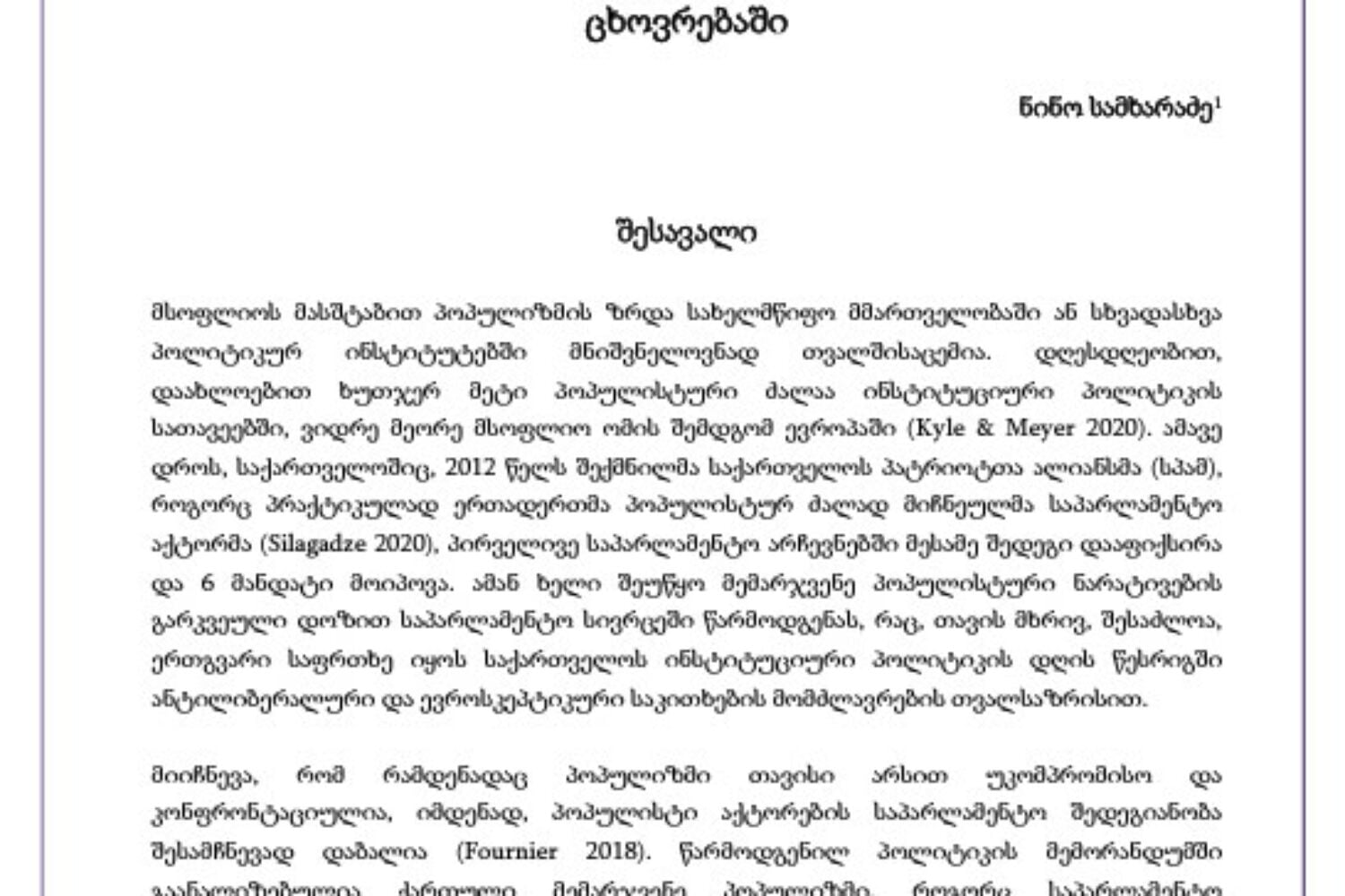 მსოფლიოს მასშტაბით პოპულიზმის ზრდა სახელმწიფო მმართველობაში ან სხვადასხვა პოლიტიკურ ინსტიტუტებში მნიშვნელოვნად თვალშისაცემია. დღესდღეობით, დაახლოებით ხუთჯერ მეტი პოპულისტური ძალაა ინსტიტუციური პოლიტიკის სათავეებში, ვიდრე მეორე მსოფლიო ომის შემდგომ ევროპაში (Kyle & Meyer 2020). ამავე დროს, საქართველოშიც, 2012 წელს შექმნილმა საქართველოს პატრიოტთა ალიანსმა (სპამ), როგორც პრაქტიკულად ერთადერთმა პოპულისტურ ძალად მიჩნეულმა საპარლამენტო აქტორმა (Silagadze 2020), პირველივე საპარლამენტო არჩევნებში მესამე შედეგი დააფიქსირადა 6 მანდატი მოიპოვა. ამან ხელი შეუწყო მემარჯვენე პოპულისტური ნარატივების გარკვეული დოზით საპარლამენტო სივრცეში წარმოდგენას, რაც, თავის მხრივ, შესაძლოა, ერთგვარი საფრთხე იყოს საქართველოს ინსტიტუციური პოლიტიკის დღის წესრიგში ანტილიბერალური და ევროსკეპტიკური საკითხების მომძლავრების თვალსაზრისით.
