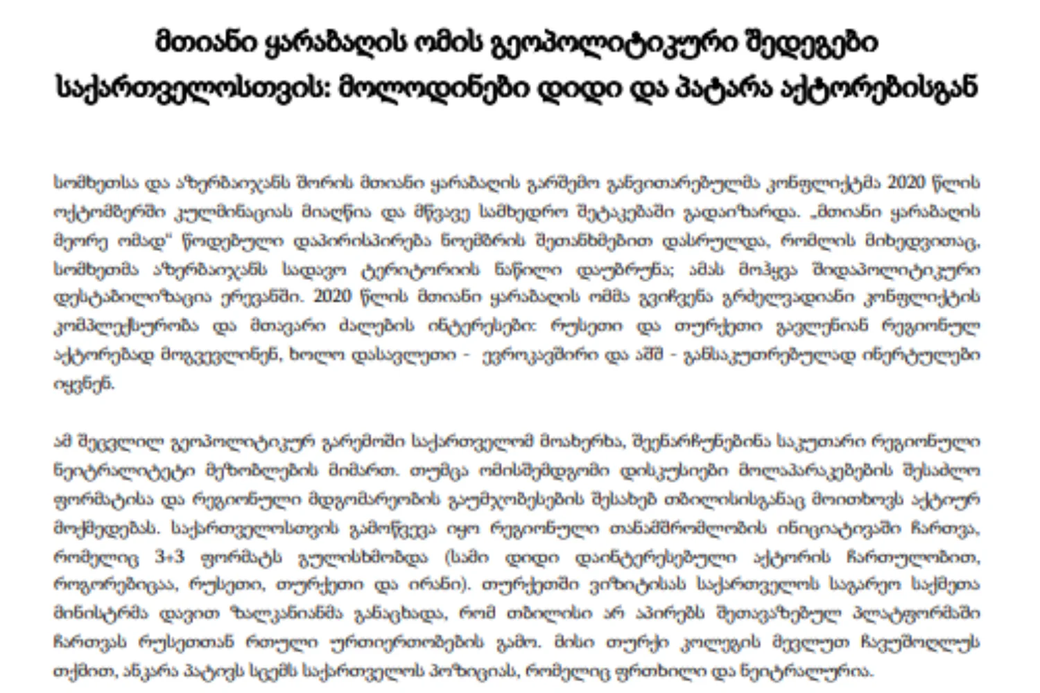 სომხეთსა და აზერბაიჯანს შორის მთიანი ყარაბაღის გარშემო განვითარებულმა კონფლიქტმა 2020 წლის ოქტომბერში კულმინაციას მიაღწია და მწვავე სამხედრო შეტაკებაში გადაიზარდა. „მთიანი ყარაბაღის მეორე ომად“ წოდებული დაპირისპირება ნოემბრის შეთანხმებით დასრულდა, რომლის მიხედვითაც, სომხეთმა აზერბაიჯანს სადავო ტერიტორიის ნაწილი დაუბრუნა; ამას მოჰყვა შიდაპოლიტიკური დესტაბილიზაცია ერევანში. 2020 წლის მთიანი ყარაბაღის ომმა გვიჩვენა გრძელვადიანი კონფლიქტის კომპლექსურობა და მთავარი ძალების ინტერესები: რუსეთი და თურქეთი გავლენიან რეგიონულ აქტორებად მოგვევლინენ, ხოლო დასავლეთი – ევროკავშირი და აშშ – განსაკუთრებულად ინერტულები იყვნენ.