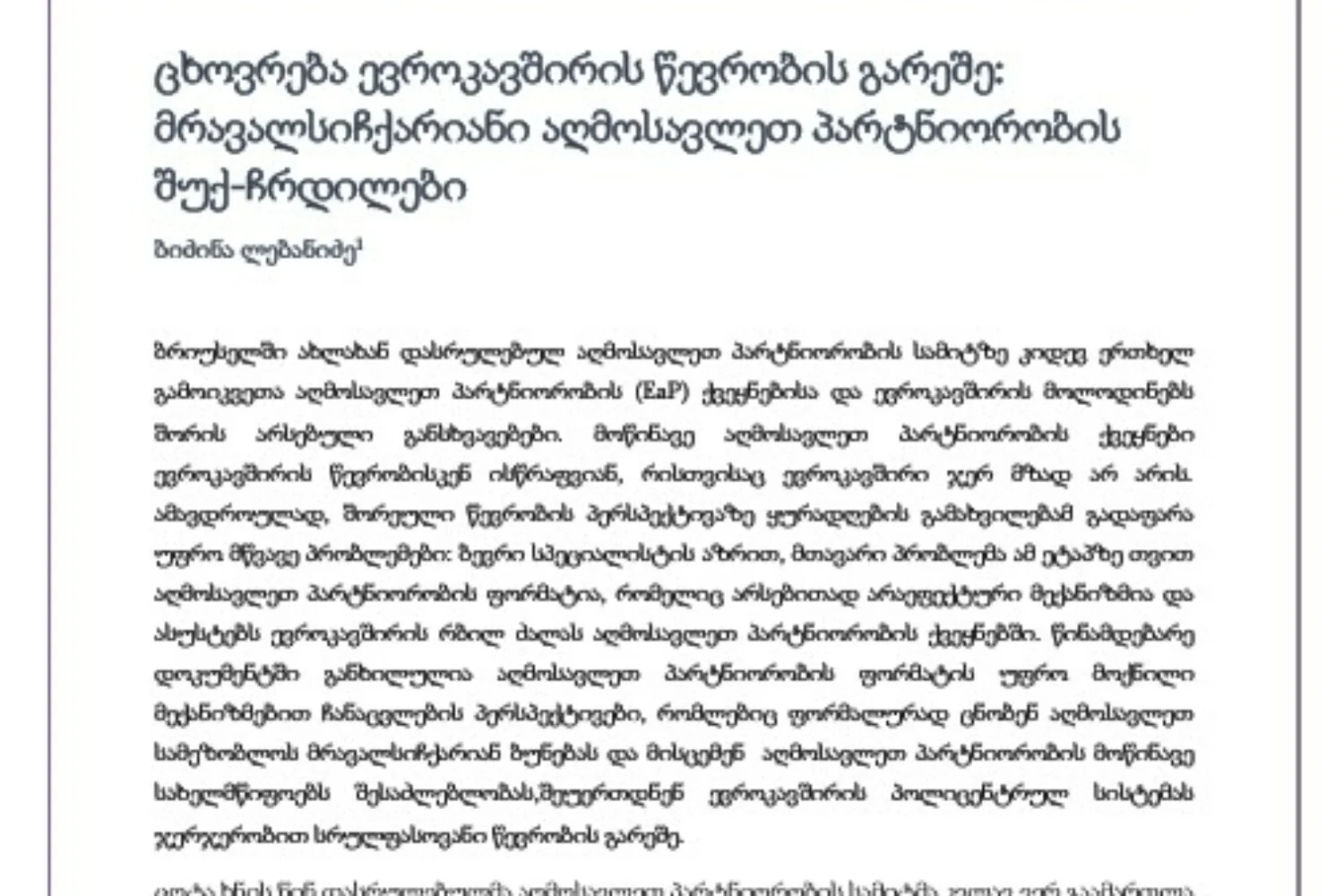 ბრიუსელში ახლახან დასრულებულ აღმოსავლეთ პარტნიორობის სამიტზე კიდევ ერთხელ გამოიკვეთა აღმოსავლეთ პარტნიორობის (EaP) ქვეყნებისა და ევროკავშირის მოლოდინებს შორის არსებული განსხვავებები. მოწინავე აღმოსავლეთ პარტნიორობის ქვეყნები ევროკავშირის წევრობისკენ ისწრაფვიან, რისთვისაც ევროკავშირი ჯერ მზად არ არის. ამავდროულად, შორეული წევრობის პერსპექტივაზე ყურადღების გამახვილებამ გადაფარა უფრო მწვავე პრობლემები: ბევრი სპეციალისტის აზრით, მთავარი პრობლემა ამ ეტაპზე თვით აღმოსავლეთ პარტნიორობის ფორმატია, რომელიც არსებითად არაეფექტური მექანიზმია და ასუსტებს ევროკავშირის რბილ ძალას აღმოსავლეთ პარტნიორობის ქვეყნებში. წინამდებარე დოკუმენტში განხილულია აღმოსავლეთ პარტნიორობის ფორმატის უფრო მოქნილი მექანიზმებით ჩანაცვლების პერსპექტივები, რომლებიც ფორმალურად ცნობენ აღმოსავლეთ სამეზობლოს მრავალსიჩქარიან ბუნებას და მისცემენ აღმოსავლეთ პარტნიორობის მოწინავე სახელმწიფოებს შესაძლებლობას,შეუერთდნენ ევროკავშირის პოლიცენტრულ სისტემას ჯერჯერობით სრულფასოვანი წევრობის გარეშე.