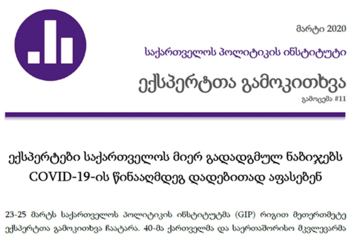 23-25 მარტს საქართველოს პოლიტიკის ინსტიტუტმა (GIP) რიგით მეთერთმეტე ექსპერტთა გამოკითხვა ჩაატარა. 40-მა ქართველმა და საერთაშორისო მკვლევარმა და პოლიტიკის ექსპერტმა უპასუხა შეკითხვებს ახლახანს გავრცელებული COVID-19-ის პანდემიის წინააღმდეგ საბრძოლველად საქართველოს მზადყოფნასთან დაკავშირებით. ექსპერტებმა დადებითად შეაფასეს საქართველოს მთავრობისა და ჯანდაცვის სისტემის მიერ მიღებული ზომები, ხოლო ქართული ეკლესიისა და მოქალაქეების ნაწილის დაუმორჩილებლობა კარანტინისა და საგანგებო მდგომარეობის წესების მიმართ ყველაზე სერიოზულ გამოწვევად დაასახელეს.