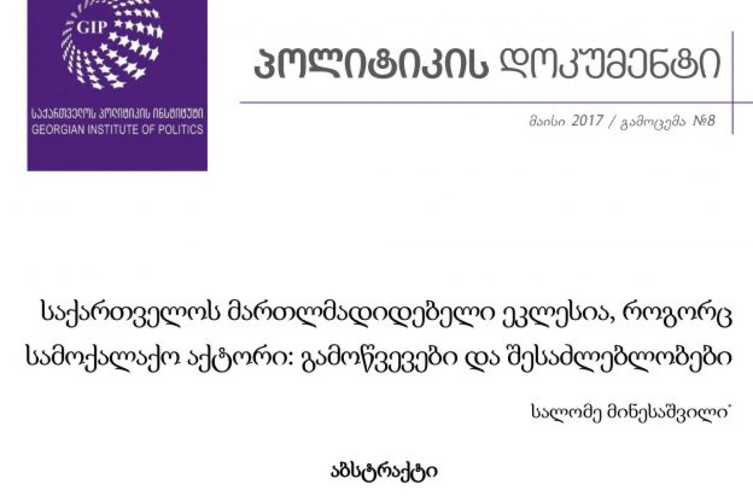 რელიგიურ ორგანიზაციას, როგორც სამოქალაქო აქტორს, მისი სოციალური კაპიტალიდან გამომდინარე, მნიშვნელოვანი როლის თამაში შეუძლია სოციალური და პოლიტიკური რეფორმის პროცესში, რისი მაგალითებიცაა აფრიკული ეკლესია სამხრეთ აფრიკაში და კათოლიკური ეკლესიის წარმომადგენლები ლათინურ ამერიკაში. ეკლესიის, როგორც სამოქალაქო აქტორის მნიშვნელობა კიდევ უფრო იზრდება დემოკრატიული ტრანზიციის პროცესში მყოფ ქვეყნებში, სადაც სამოქალაქო სექტორი ჯერ კიდევ არაორგანიზებული და სუსტია. მისგან განსხვავებით, ეკლესიას საზოგადოებაში ბევრად მაღალი ავტორიტეტი, ორგანიზების უნარი და ავტონომია გააჩნია. სწორედ ეს ახასიათებს საქართველოს მართლმადიდებელ ეკლესიას, რომელიც არამხოლოდ ფლობს რიგ უპირატესობებს სხვა სამოქალაქო აქტორებთან შედარებით, არამედ აქტიურადაც მონაწილეობს საზოგადოებასა და სახელმწიფოში მიმდინარე პროცესებში. პოლიტიკის დოკუმენტი განიხილავს საქართველოს მართლმადიდებელი ეკლესიის, როგორც სამოქალაქო აქტორის საქმიანობას, მის გამოწვევებსა და პოტენციალს მიმდინარე დემოკრატიზაციის პროცესში, მის როლს პლურალურ სამოქალაქო კონტექსტში და ურთიერთობას ამ სექტორის სხვა წარმომადგენლებთან.