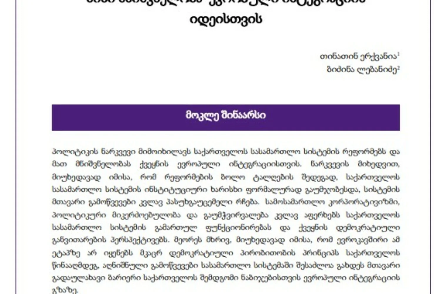 აღნიშნული დოკუმენტი მიმოიხილავს საქართველოში ბოლო პერიოდში განხორციელებული სასამართლო რეფორმების დინამიკას და მათ შესაბამისობას ევროკავშირის მოთხოვნებთან, გამოყოფს ძირითად გამოწვევებს და წარმოადგენს რეკომენდაციებს სასამართლო სისტემის ეფექტურობის გაუმჯობესების და დემოკრატიული ხარისხის ამაღლების მიზნით.