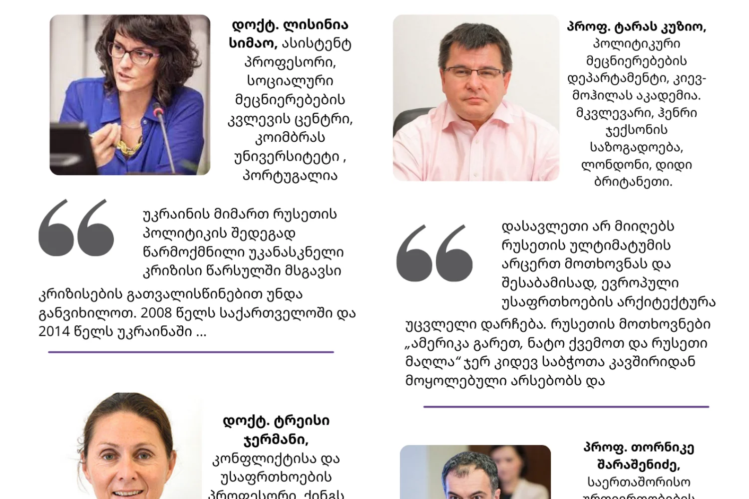 1. თქვენი აზრით, რა ძირითადი შედეგები ექნება ნატოსა და რუსეთის მიმდინარე დაპირისპირებას ევროპის უსაფრთხოების არქიტექტურაზე და მასში საქართველოს როლზე?