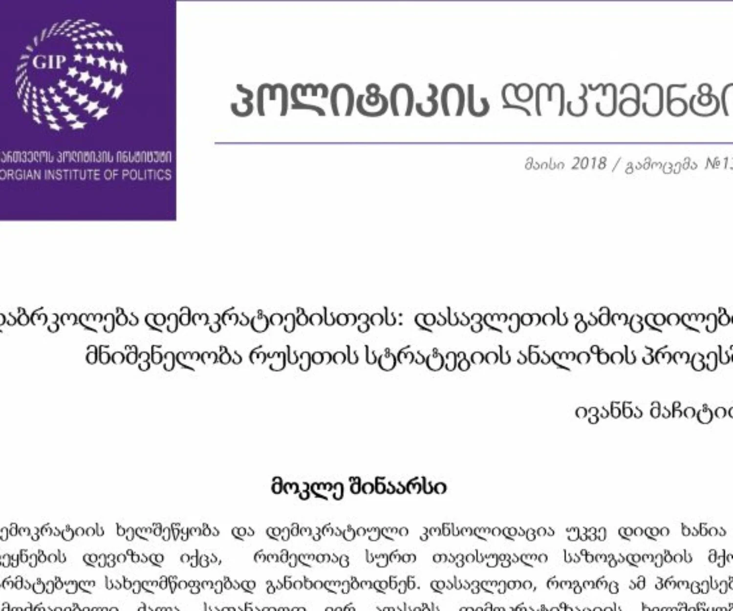 კატეგორიის გარეშე 01 მაი 2018 დაბრკოლება დემოკრატიებისთვის: დასავლეთის გამოცდილების მნიშვნელობა რუსეთის სტრატეგიის ანალიზის პროცესშიდემოკრატიის ხელშეწყობა და დემოკრატიული კონსოლიდაცია უკვე დიდი ხანია იმ ქვეყნების დევიზად იქცა, … GIP