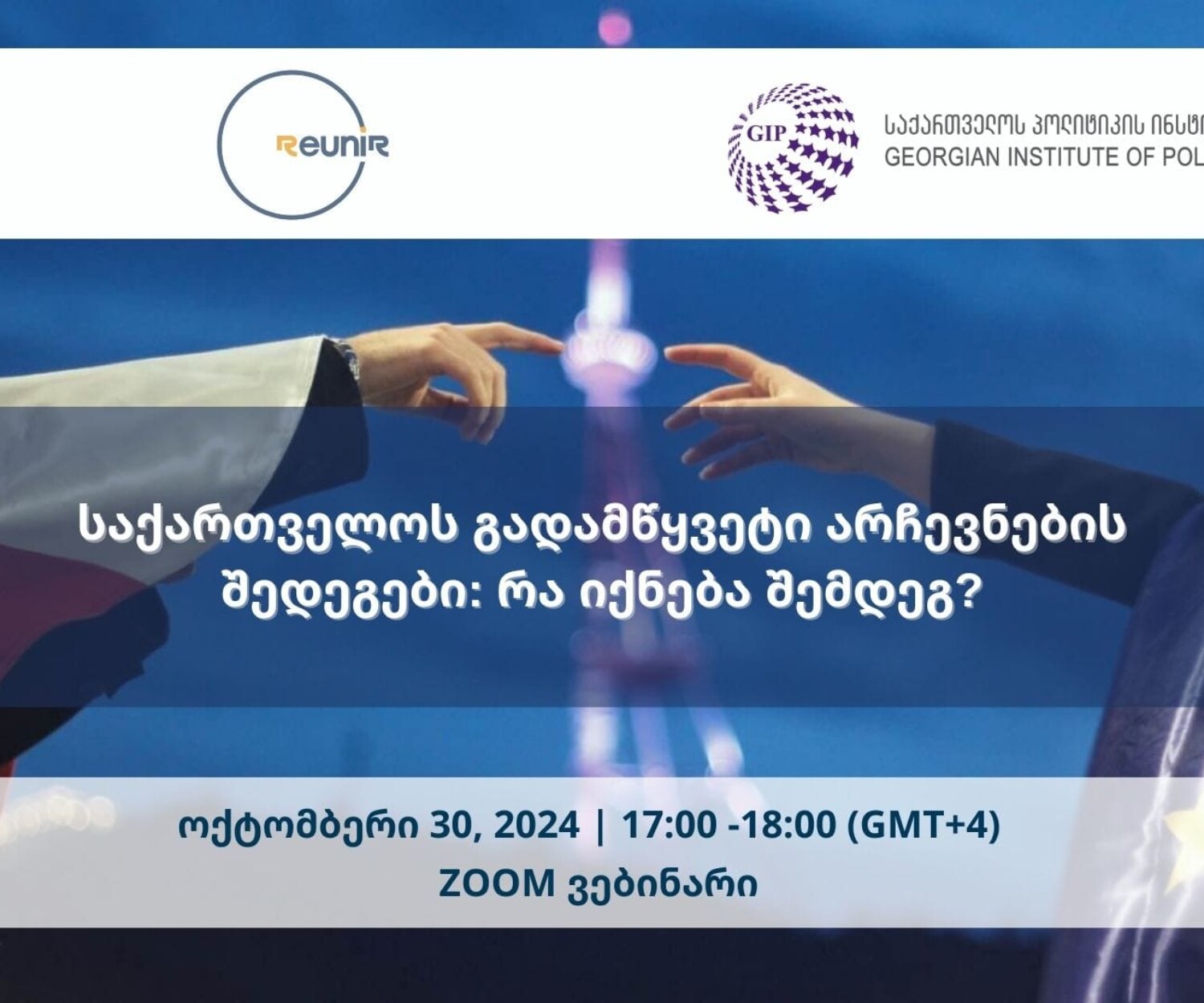 სიახლეები 01 ნოე 2024 GIP-იმ უმასპინძლა REUNIR-ის ვებინარს საქართველოს გადამწყვეტი არჩევნების შედეგებზე: რა იქნება შემდეგ?30 ოქტომბერს, საქართველოს პოლიტიკის ინსტიტუტმა უმასპინძლა REUNIR- ის ვებინარს „საქართველოს გადამწყვეტი არჩევნების… GIP