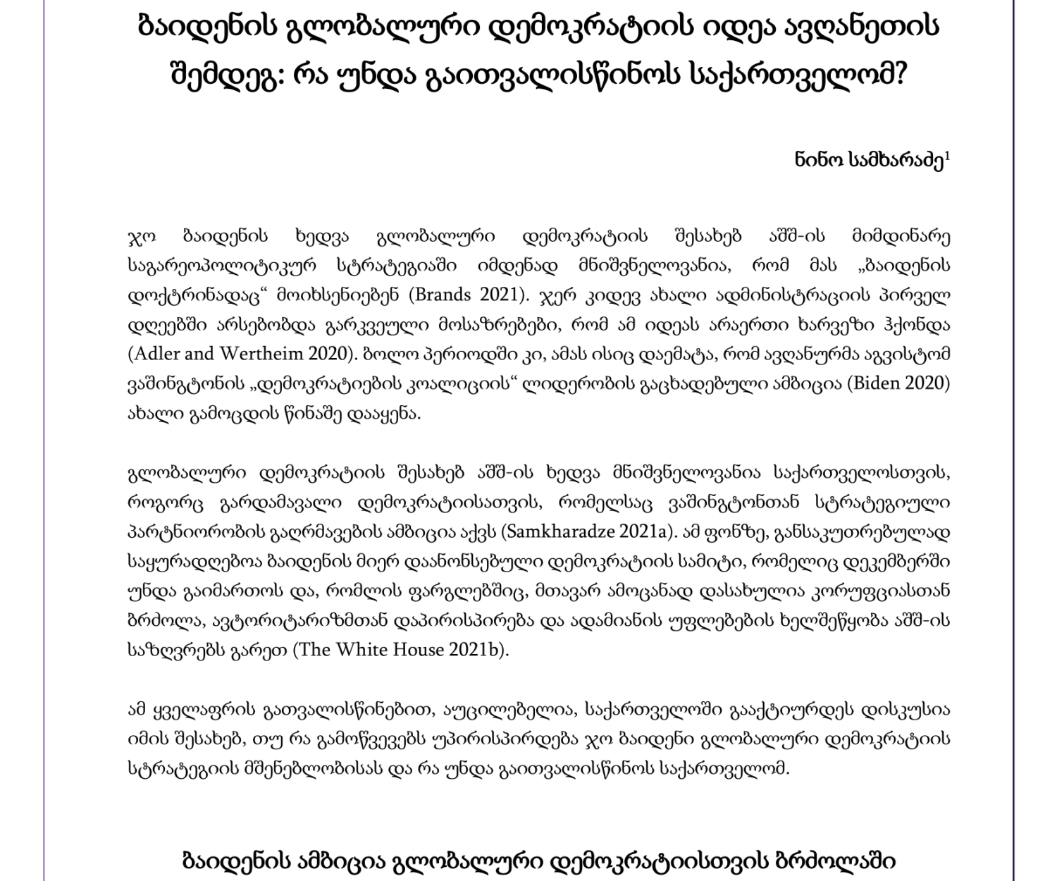 კატეგორიის გარეშე 17 სექ 2021 ბაიდენის გლობალური დემოკრატიის იდეა ავღანეთის შემდეგ: რა უნდა გაითვალისწინოს საქართველომ?ბარაკ ობამას ადმინისტრაციის მიერ აშშ-ს საგარეო პოლიტიკის აზიისკენ რეორიენტაციის შემდეგ, აღმოსავლეთ პარტნიორობის… ნინო სამხარაძე