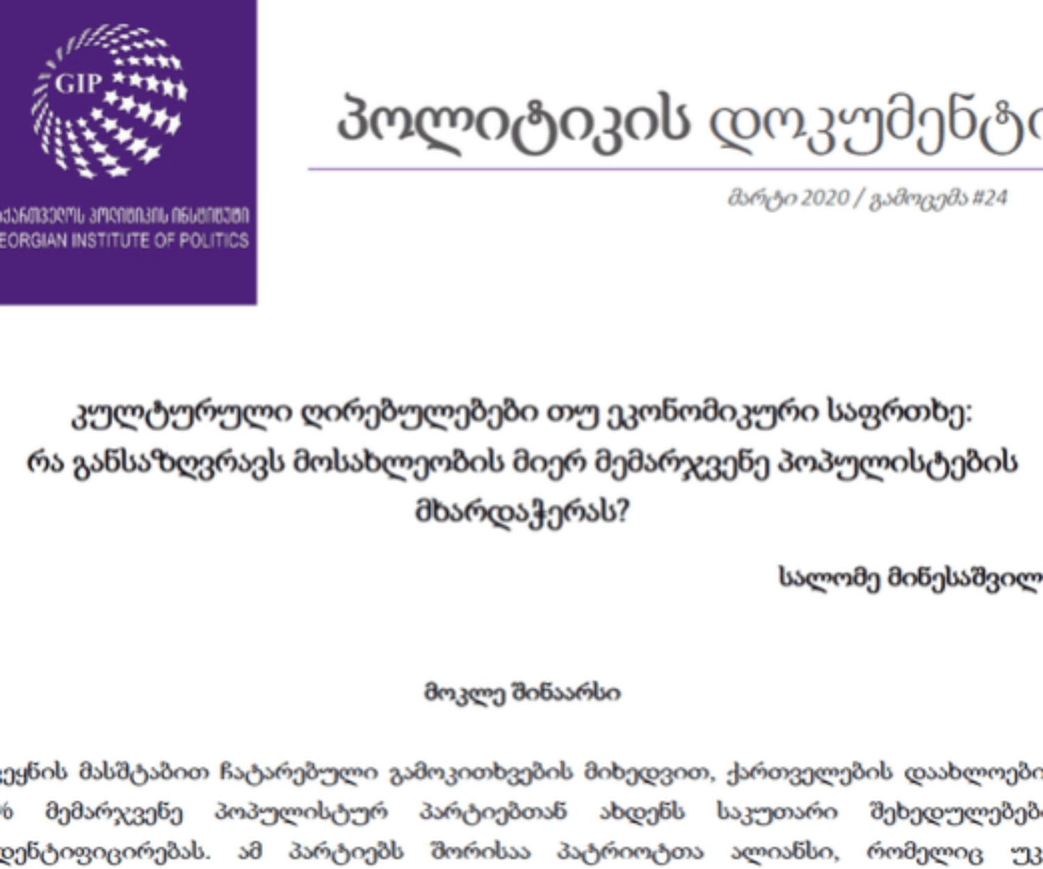 კატეგორიის გარეშე 06 მარ 2020 კულტურული ღირებულებები თუ ეკონომიკური საფრთხე: რა განსაზღვრავს მოსახლეობის მიერ მემარჯვენე პოპულისტების მხარდაჭერას?ქვეყნის მასშტაბით ჩატარებული გამოკითხვების მიხედვით, ქართველების დაახლოებით 7% მემარჯვენე პოპულისტურ პარტიებთან ახდენს… GIP