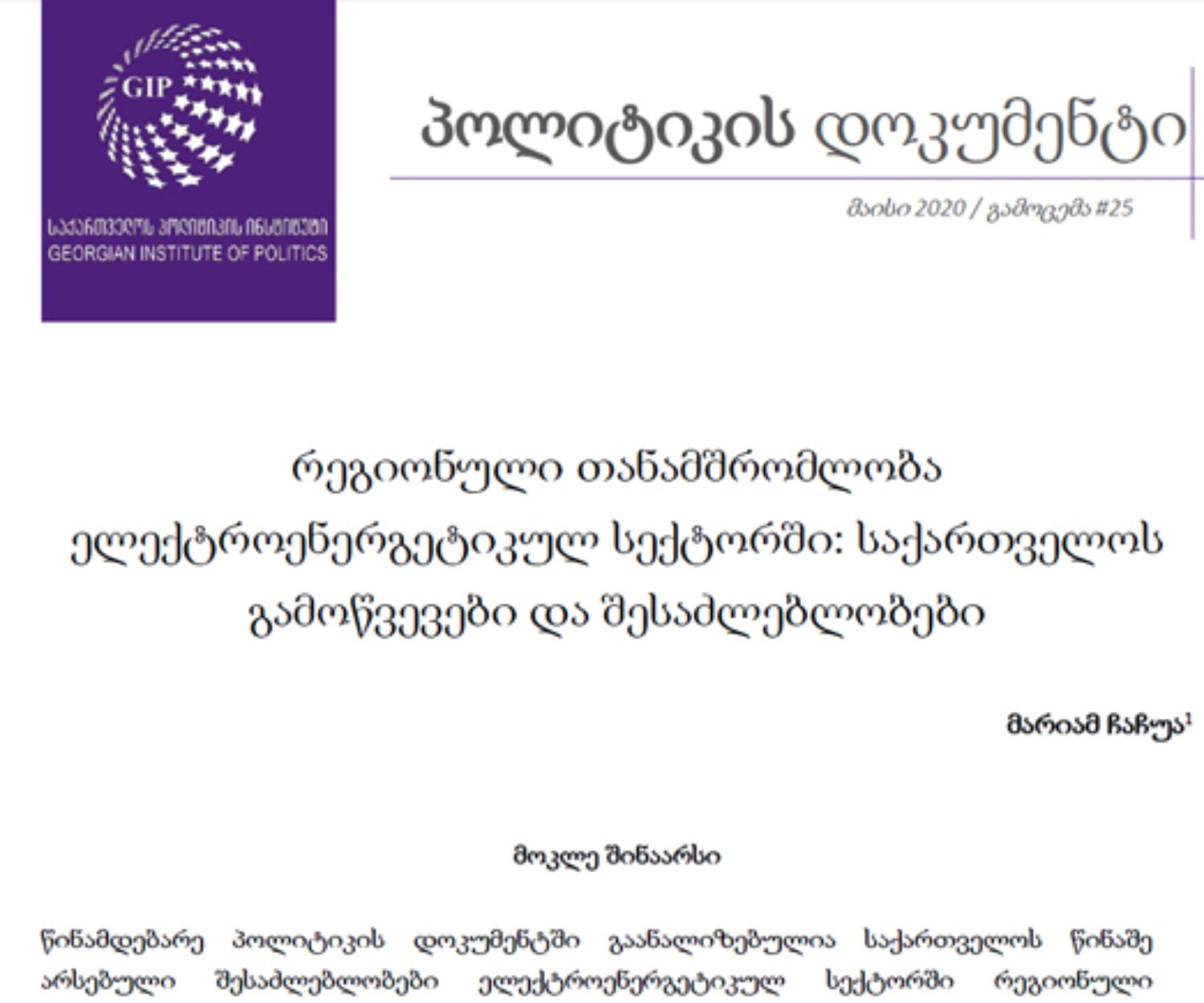 კატეგორიის გარეშე 17 მაი 2020 რეგიონული თანამშრომლობა ელექტროენერგეტიკულ სექტორში: საქართველოს გამოწვევები და შესაძლებლობებიწინამდებარე პოლიტიკის დოკუმენტში გაანალიზებულია საქართველოს წინაშე არსებული შესაძლებლობები ელექტროენერგეტიკულ სექტორში რეგიონული თანამშრომლობისა… GIP