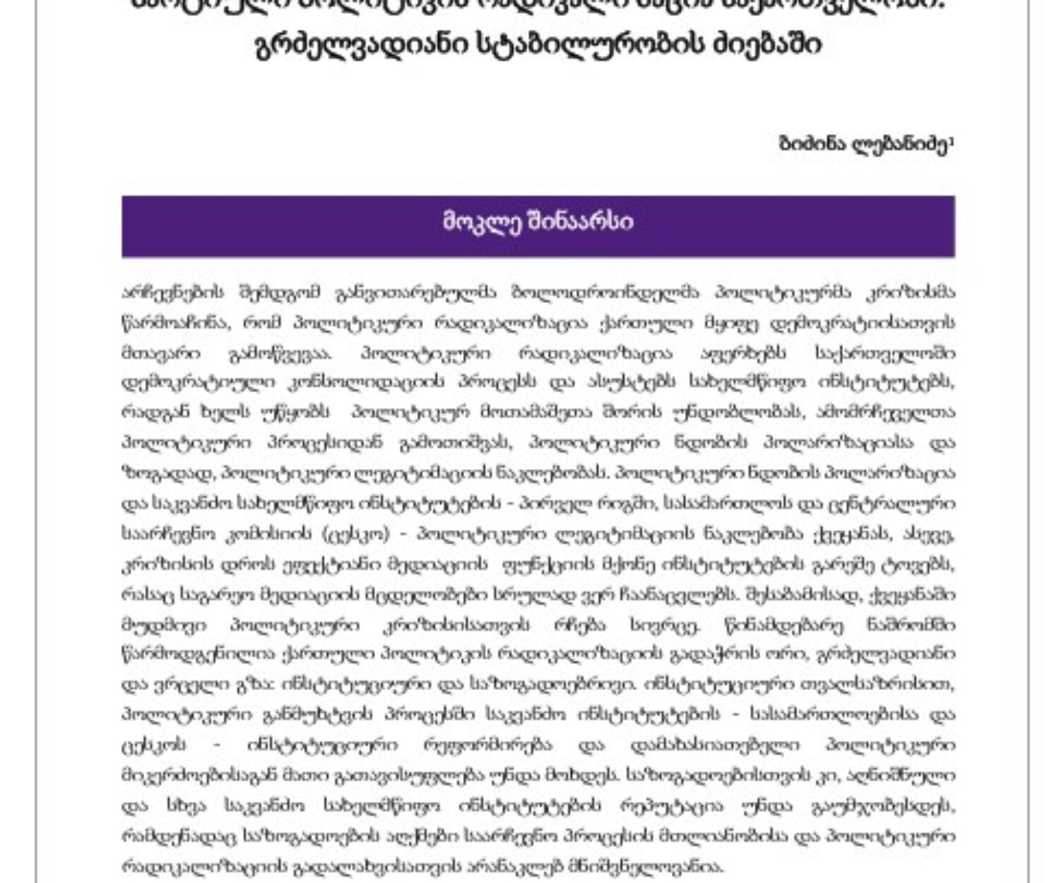 კატეგორიის გარეშე 26 მაი 2021 პარტიული პოლიტიკის რადიკალიზაცია საქართველოში: გრძელვადიანი სტაბილურობის ძიებაშიარჩევნების შემდგომ განვითარებულმა ბოლოდროინდელმა პოლიტიკურმა კრიზისმა წარმოაჩინა, რომ პოლიტიკური რადიკალიზაცია ქართული მყიფე… ბიძინა ლებანიძე, keta