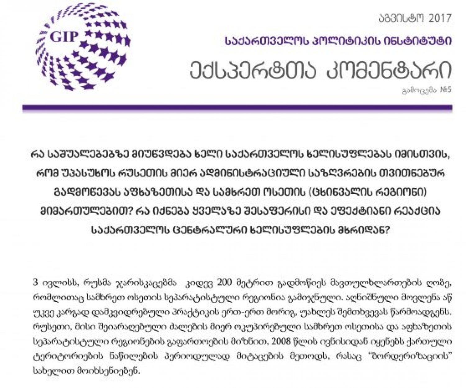 კატეგორიის გარეშე 20 დეკ 2017 ბორდერიზაცია საქართველოში: რუსეთის პოლიტიკის შეკავების სტრატეგიამოუგვარებელი კონფლიქტების მანიპულირების მიზნით, რუსეთის მიერ სამხედრო, პოლიტიკური და ინფორმაციული ტაქტიკის გამოყენება… GIP
