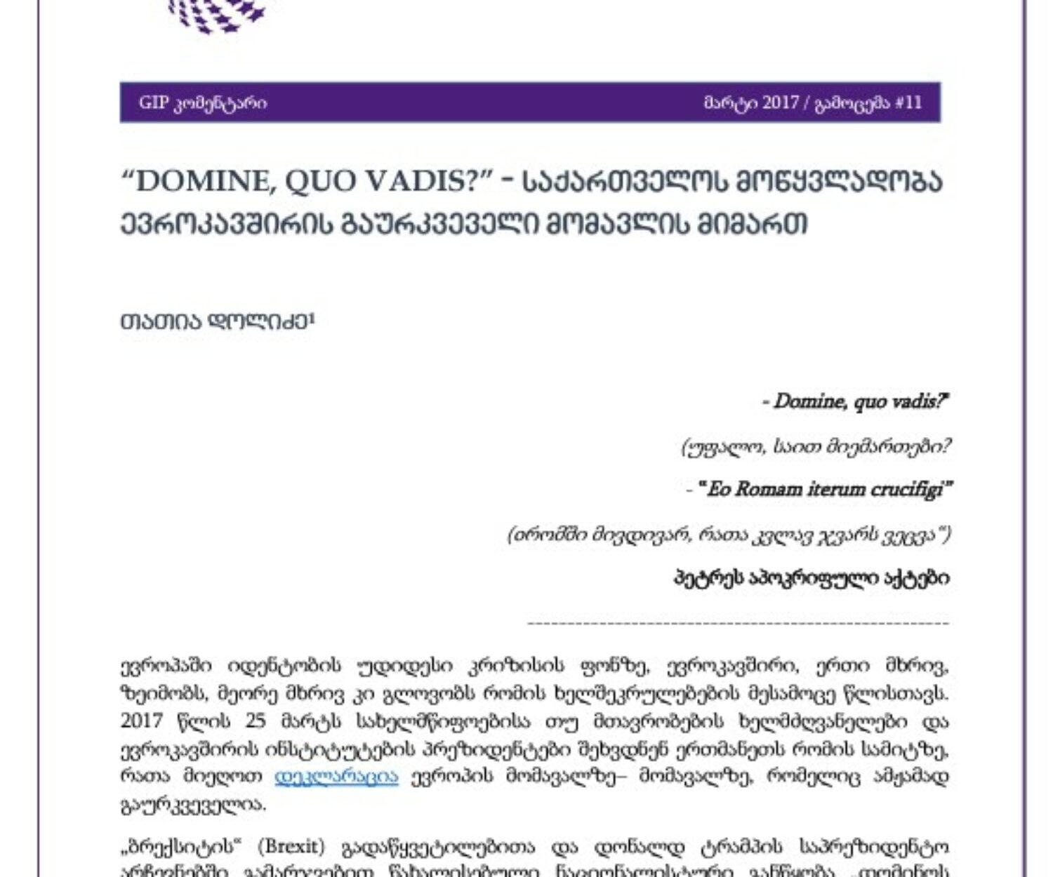 კატეგორიის გარეშე 27 მარ 2017 “Domine, quo vadis?” – საქართველოს მოწყვლადობა ევროკავშირის გაურკვეველი მომავლის მიმართევროპაში იდენტობის უდიდესი კრიზისის ფონზე, ევროკავშირი, ერთი მხრივ, ზეიმობს, მეორე მხრივ კი… GIP