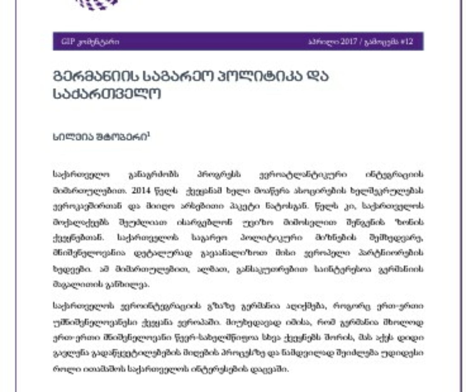 კატეგორიის გარეშე 03 აპრ 2017 გერმანიის საგარეო პოლიტიკა და საქართველოსაქართველო განაგრძობს პროგრესს ევროატლანტიკური ინტეგრაციის მიმართულებით. 2014 წელს ქვეყანამ ხელი მოაწერა ასოცირების… GIP