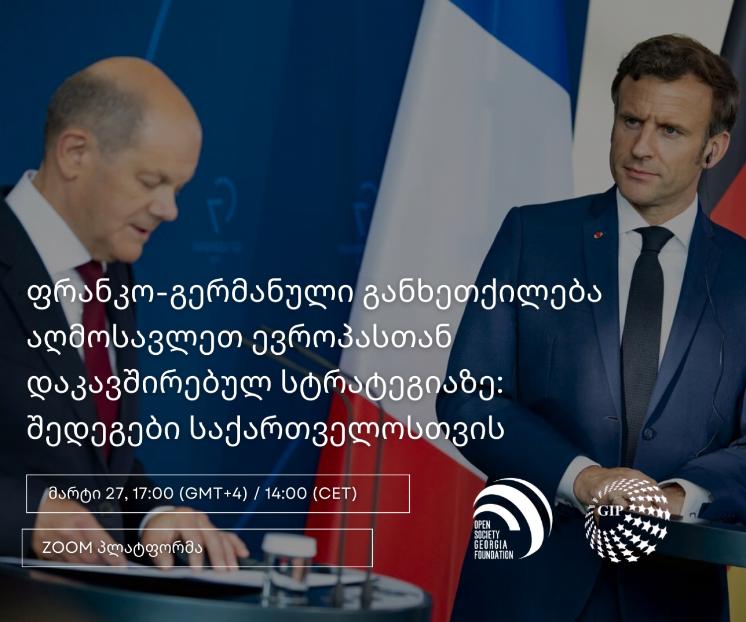 სიახლეები 28 მარ 2024 ბრიფინგი – „ფრანკო-გერმანული განხეთქილება აღმოსავლეთ ევროპასთან დაკავშირებულ სტრატეგიაზე: შედეგები საქართველოსთვის“27 მარტს საქართველოს პოლიტიკის ინსტიტუტის ორგანიზებით გაიმართა ონლაინ ბრიფინგი სახელწოდებით „ფრანკო-გერმანული განხეთქილება… GIP