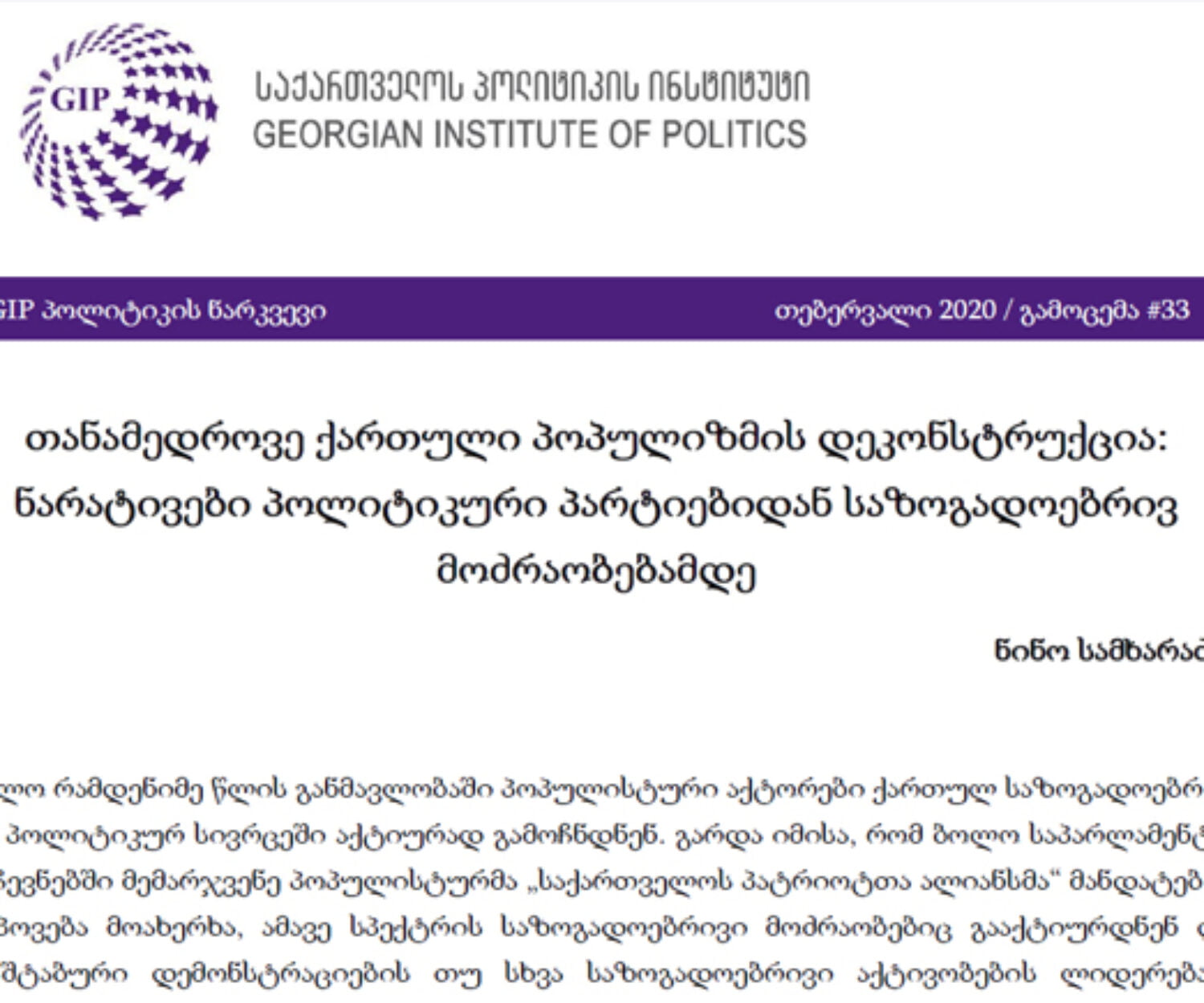 კატეგორიის გარეშე 13 თებ 2020 თანამედროვე ქართული პოპულიზმის დეკონსტრუქცია: ნარატივები პოლიტიკური პარტიებიდან საზოგადოებრივ მოძრაობებამდებოლო რამდენიმე წლის განმავლობაში პოპულისტური აქტორები ქართულ საზოგადოებრივ და პოლიტიკურ სივრცეში აქტიურად… ნინო სამხარაძე