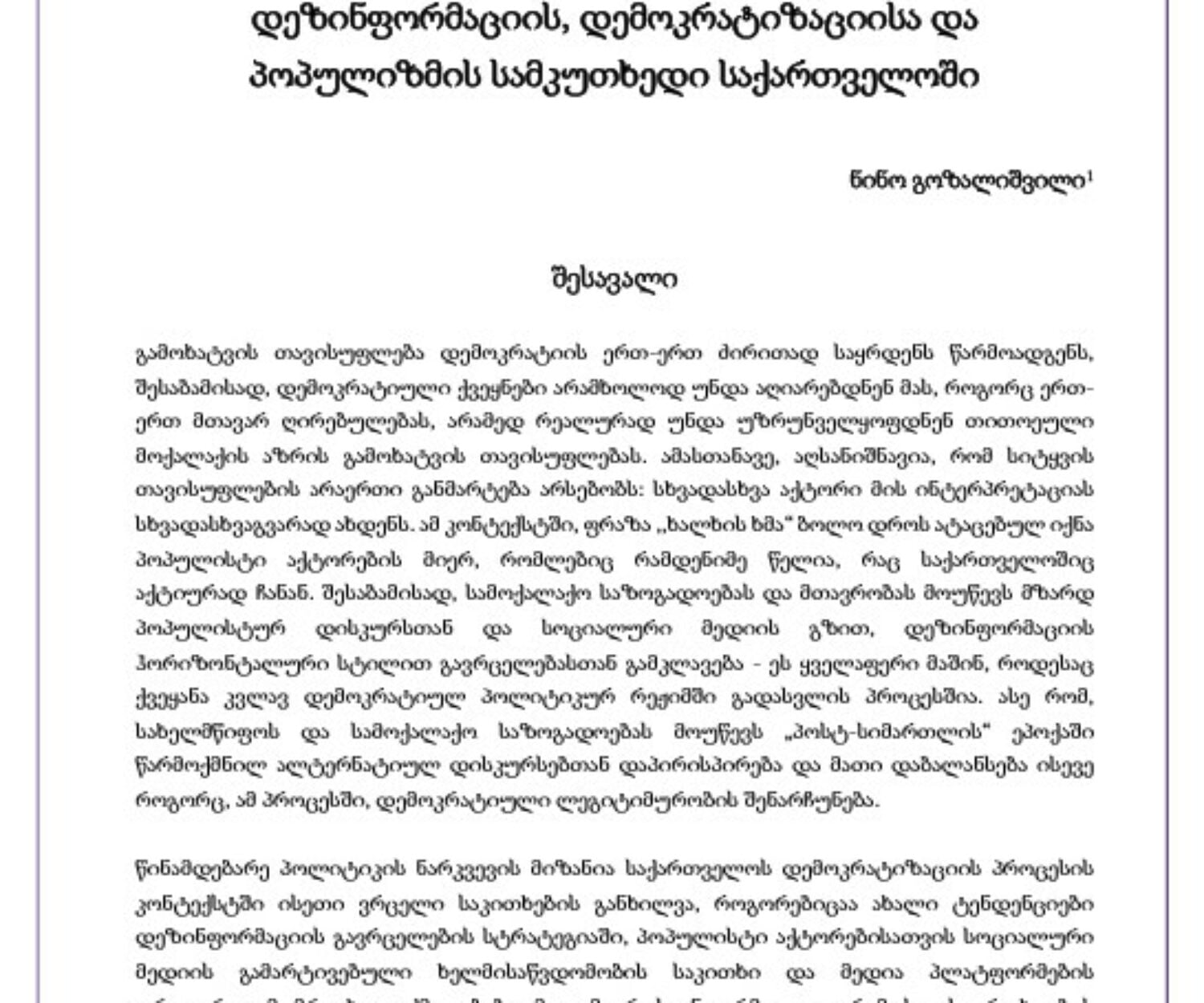 კატეგორიის გარეშე 25 თებ 2021 დეზინფორმაციის, დემოკრატიზაციისა და პოპულიზმის სამკუთხედი საქართველოშიგამოხატვის თავისუფლება დემოკრატიის ერთ-ერთ ძირითად საყრდენს წარმოადგენს, შესაბამისად, დემოკრატიული ქვეყნები არამხოლოდ უნდა… ნინო გოზალიშვილი, keta
