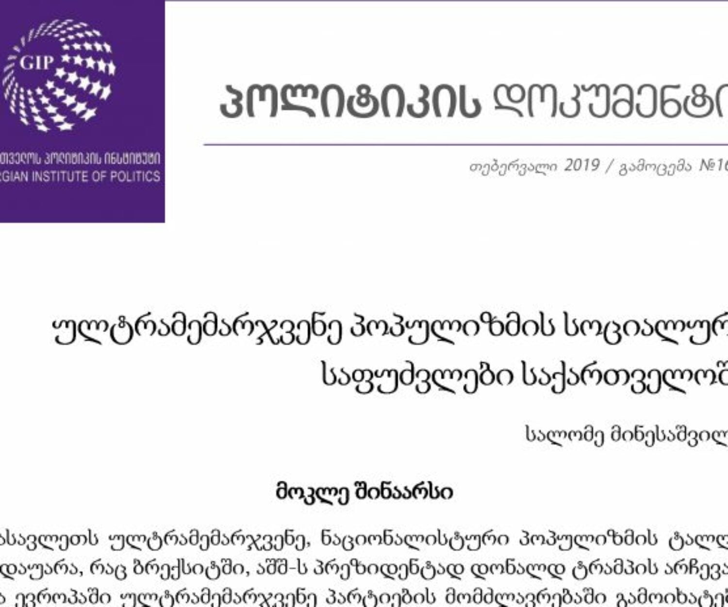 კატეგორიის გარეშე 20 თებ 2019 ულტრამემარჯვენე პოპულიზმის სოციალური საფუძვლები საქართველოშიდასავლეთს ულტრამემარჯვენე, ნაციონალისტური პოპულიზმის ტალღამ გადაუარა, რაც ბრექსიტში, აშშ-ს პრეზიდენტად დონალდ ტრამპის… GIP