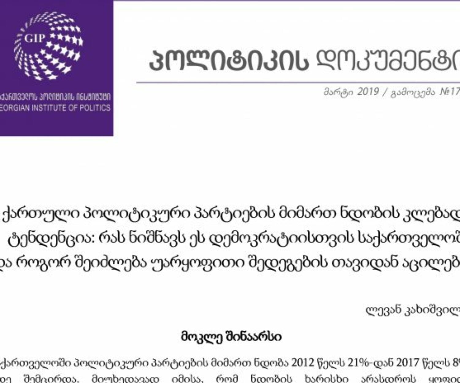 კატეგორიის გარეშე 13 მარ 2019 ქართული პოლიტიკური პარტიების მიმართ ნდობის კლებადი ტენდენცია: რას ნიშნავს ეს დემოკრატიისთვის საქართველოში და როგორ შეიძლება უარყოფითი შედეგების თავიდან აცილება?საქართველოში პოლიტიკური პარტიების მიმართ ნდობა 2012 წელს 21%-დან 2017 წელს 8%-მდე შემცირდა.… GIP