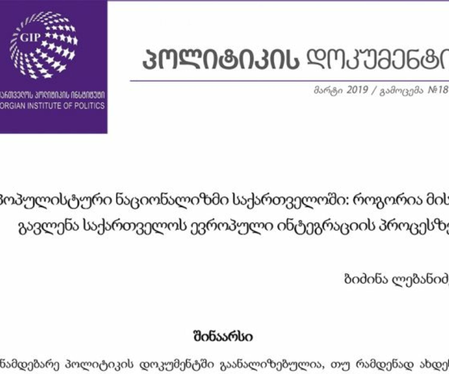 კატეგორიის გარეშე 29 მარ 2019 პოპულისტური ნაციონალიზმი საქართველოში: როგორია მისი გავლენა საქართველოს ევროპული ინტეგრაციის პროცესზე?წინამდებარე პოლიტიკის დოკუმენტში გაანალიზებულია, თუ რამდენად ახდენს გავლენას პოპულისტური ნაციონალიზმის მზარდი ტენდენცია… GIP