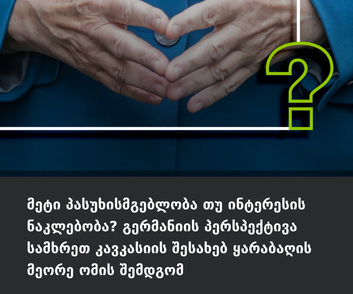 კატეგორიის გარეშე 16 დეკ 2021 მეტი პასუხისმგებლობა თუ ინტერესის ნაკლებობა? გერმანიის პერსპექტივა სამხრეთ კავკასიის შესახებ ყარაბაღის მეორე ომის შემდგომგერმანიის ახალი ფედერალური მთავრობა, არამხოლოდ გერმანიის საგარეო პოლიტიკის მიმართულებას გადაწყვეტს, არამედ, ევროკავშირის… მიხეილ სარჯველაძე
