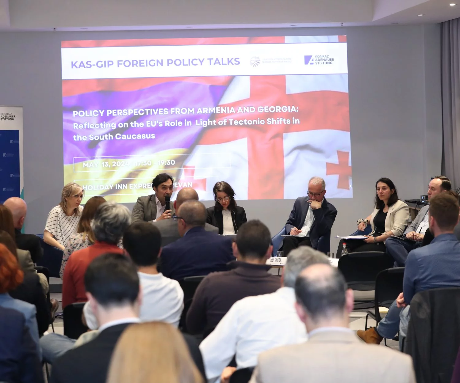 სიახლეები 14 მაი 2024 პოლიტიკური პერსპექტივები სომხეთიდან და საქართველოდან: “KAS-GIP საგარეო პოლიტიკის საუბრები” ერევანში გაიმართა“KAS-GIP საგარეო პოლიტიკის საუბრების” სამხრეთ კავკასიის სერია დაიწყო მრგვალი მაგიდის დისკუსიით თემაზე… GIP