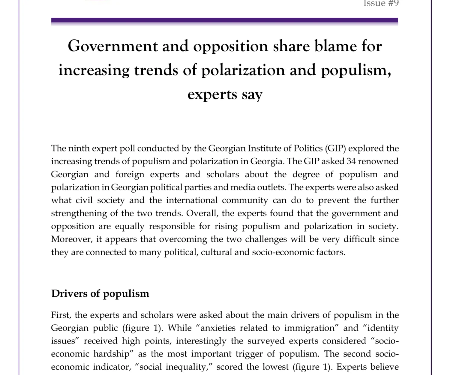Uncategorized 23 Apr 2019 Government and opposition share blame for increasing trends of polarization and populism, experts sayExpert Polls # 9, Georgian Institute of Politics, April 2019. Kornely Kakachia