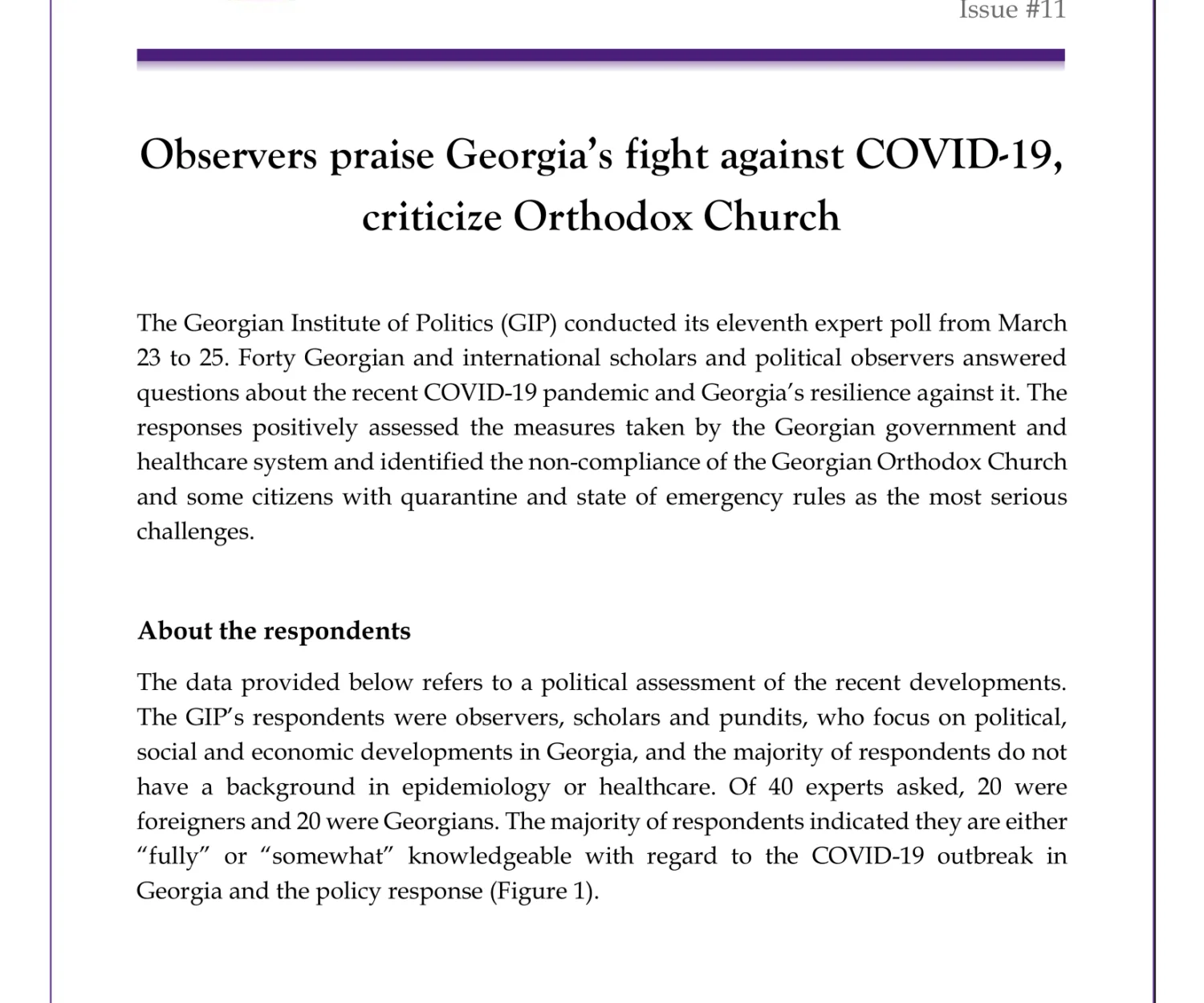 Uncategorized 25 Mar 2020 Observers praise Georgia’s fight against COVID-19, criticize Orthodox ChurchExpert Polls #11, Georgian Institute of Politics, March 2020 GIP