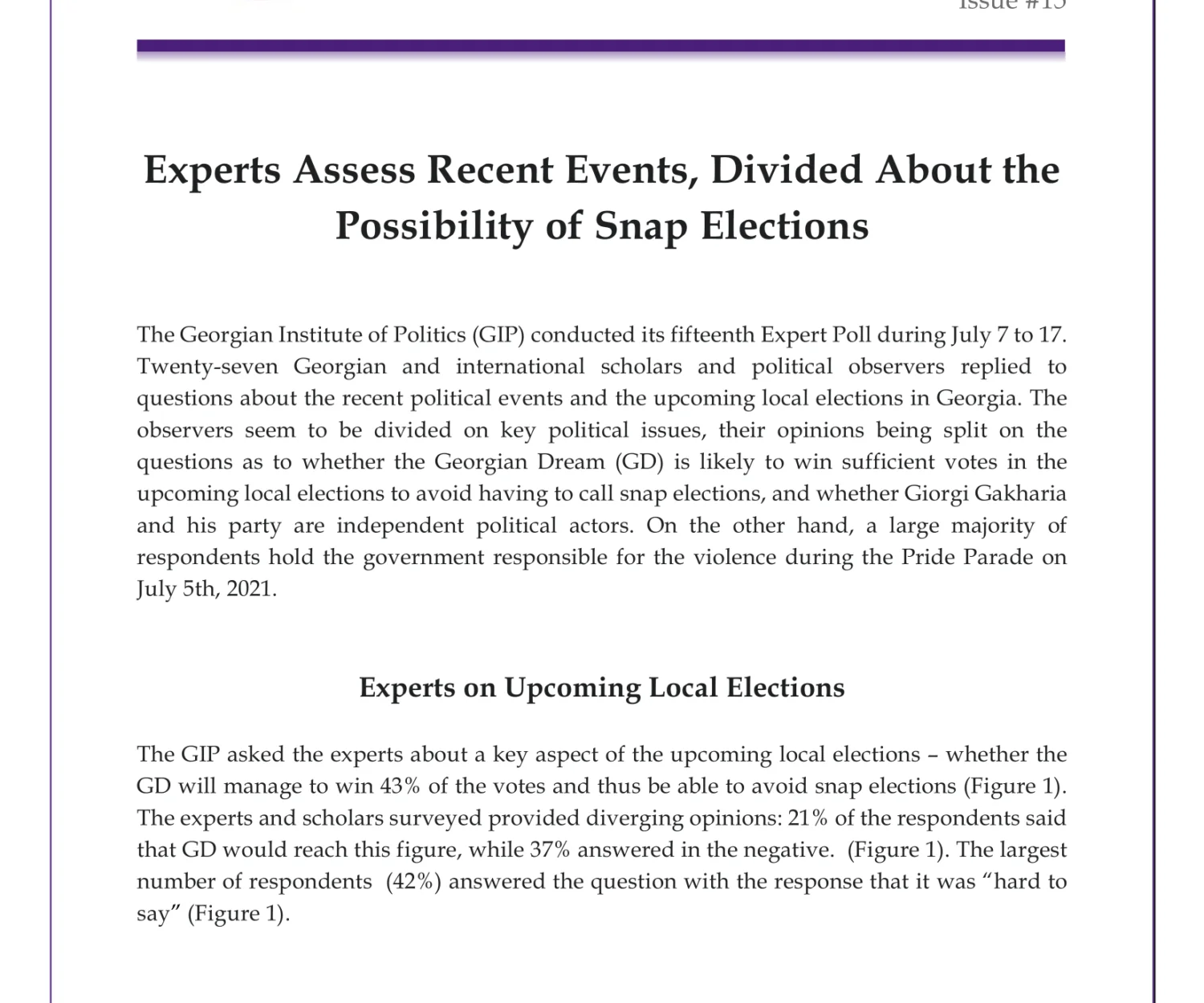 Uncategorized 28 Jul 2021 Experts Assess Recent Events, Divided About the Possibility of Snap ElectionsExpert Polls #15, Georgian Institute of Politics, July, 2021 GIP