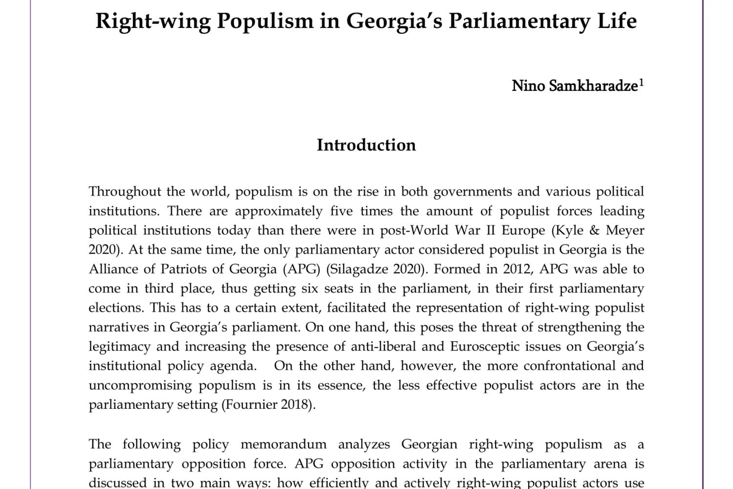 The following policy memorandum analyzes Georgian right-wing populism as a parliamentary opposition force. APG opposition activity in the parliamentary arena is discussed in two main ways: how efficiently and actively right-wing populist actors use parliamentary tools to pursue their own interests and to what extent their parliamentary activities reflect the content of their narratives. In order to answer these questions, the paper reviews the legislative initiatives instigated by the Alliance of Patriots of Georgia. Additionally, this work draws attention to analyzing how such parliamentary actors acted in relation to other legislations and documents. In the end, public statements from the parliamentary rostrum are reviewed in order to determine the type of content aired by the right-wing populist actors in the previous parliament and how closely their political narratives are related to populism.