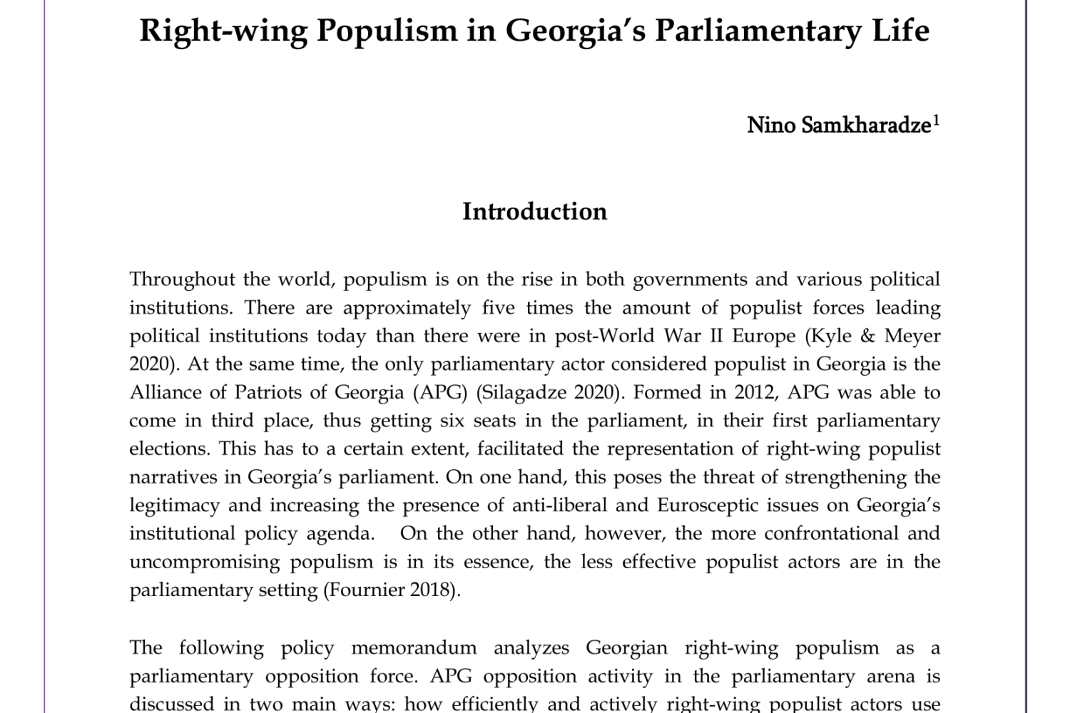 The following policy memorandum analyzes Georgian right-wing populism as a parliamentary opposition force. APG opposition activity in the parliamentary arena is discussed in two main ways: how efficiently and actively right-wing populist actors use parliamentary tools to pursue their own interests and to what extent their parliamentary activities reflect the content of their narratives. In order to answer these questions, the paper reviews the legislative initiatives instigated by the Alliance of Patriots of Georgia. Additionally, this work draws attention to analyzing how such parliamentary actors acted in relation to other legislations and documents. In the end, public statements from the parliamentary rostrum are reviewed in order to determine the type of content aired by the right-wing populist actors in the previous parliament and how closely their political narratives are related to populism.