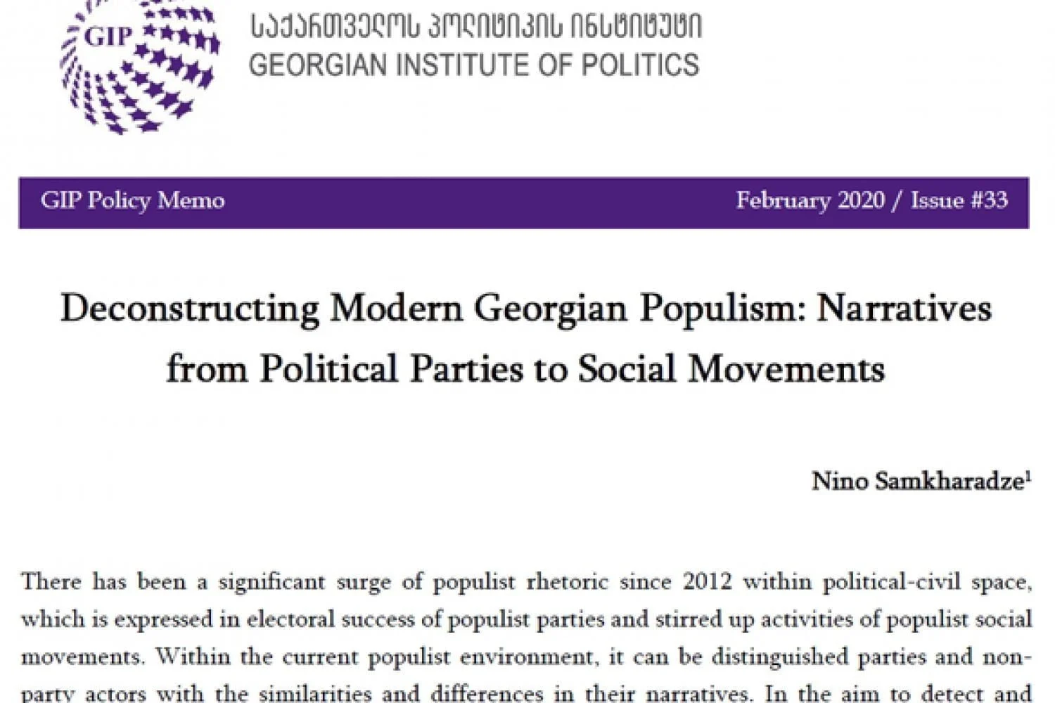 There has been a significant surge of populist rhetoric since 2012 within political-civil space, which is expressed in electoral success of populist parties and stirred up activities of populist social movements. Within the current populist environment, it can be distinguished parties and non-party actors with the similarities and differences in their narratives.In the aim to detect and analyze them four subjects had been selected: programs, activities and speeches of political parties “Alliance of Patriots of Georgia”, “Georgian Labor Party”, and the social movements “Georgian March” and “Georgian National Unity” are under the focus. Analyses reveals several dichotomous narratives among which the anti-elite rhetoric against the government, liberal groups, various business-groups is most spread. Besides, the nativist attitudes are dominant to mobilize anti-immigration pathos, an orthodox accents side by side the anti-liberalism as the leading narrative as well. And lastly, in most of the actors’ narratives except from the Labors it is observed the attempts to distance from the west and support tightening relations with Russia, cover up this dichotomy with the support to the non-alignment movement and balance it with radical anti-Turkish narrative. The paper highlights also the differences among the various actors according to their ideological belonging, overall purposes and historical developments.