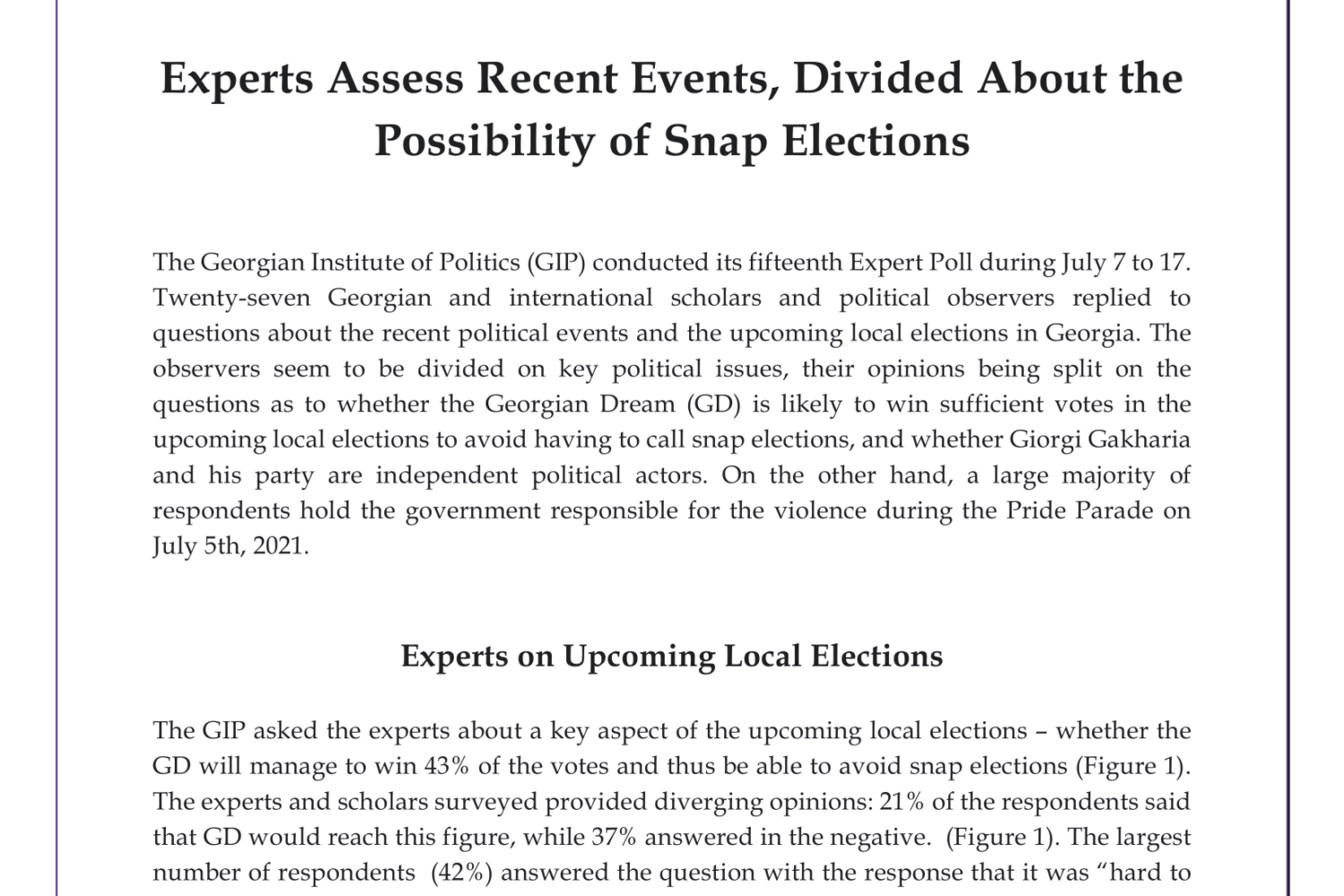 The Georgian Institute of Politics (GIP) conducted its fifteenth Expert Poll during July 7 to 17. Twenty-seven Georgian and international scholars and political observers replied to questions about the recent political events and the upcoming local elections in Georgia. The observers seem to be divided on key political issues, their opinions being split on the questions as to whether the Georgian Dream (GD) is likely to win sufficient votes in the upcoming local elections to avoid having to call snap elections, and whether Giorgi Gakharia and his party are independent political actors. On the other hand, a large majority of respondents hold the government responsible for the violence during the Pride Parade on July 5th, 2021.