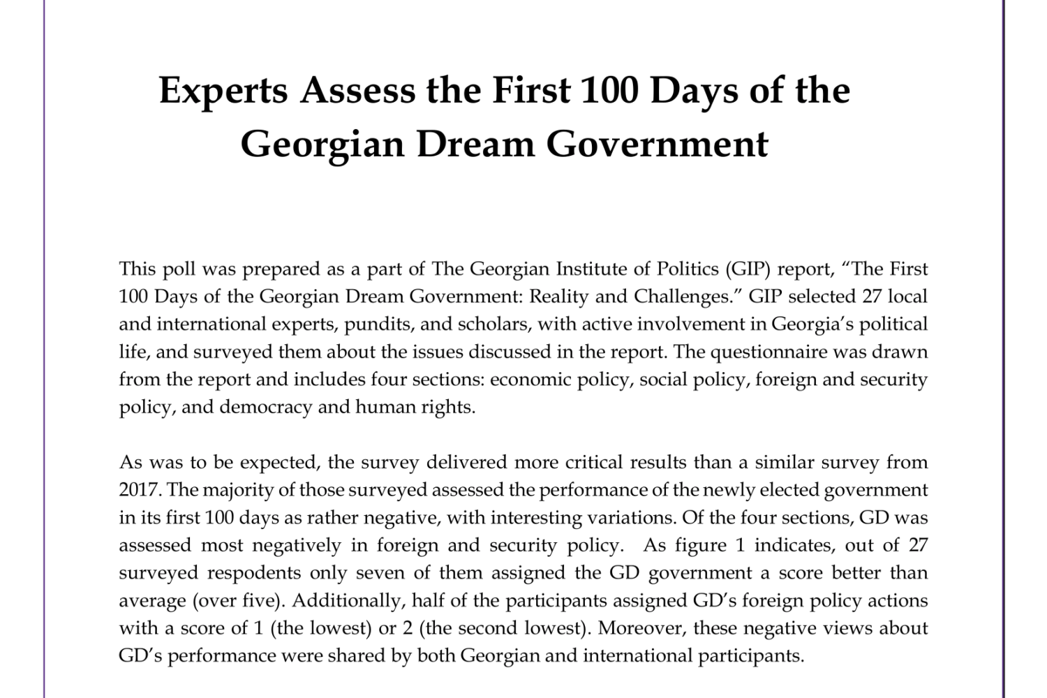 This poll was prepared as a part of The Georgian Institute of Politics (GIP) report, “The First 100 Days of the Georgian Dream Government: Reality and Challenges.” GIP selected 27 local and international experts, pundits, and scholars, with active involvement in Georgia’s political life, and surveyed them about the issues discussed in the report. The questionnaire was drawn from the report and includes four sections: economic policy, social policy, foreign and security policy, and democracy and human rights.