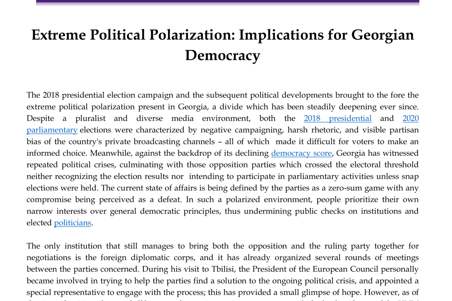 The 2018 presidential election campaign and the subsequent political developments brought to the fore the extreme political polarization present in Georgia, a divide which has been steadily deepening ever since. Despite a pluralist and diverse media environment, both the 2018 presidential and 2020 parliamentary elections were characterized by negative campaigning, harsh rhetoric, and visible partisan bias of the country’s private broadcasting channels – all of which made it difficult for voters to make an informed choice. Meanwhile, against the backdrop of its declining democracy score, Georgia has witnessed repeated political crises, culminating with those opposition parties which crossed the electoral threshold neither recognizing the election results nor intending to participate in parliamentary activities unless snap elections were held. The current state of affairs is being defined by the parties as a zero-sum game with any compromise being perceived as a defeat. In such a polarized environment, people prioritize their own narrow interests over general democratic principles, thus undermining public checks on institutions and elected politicians.