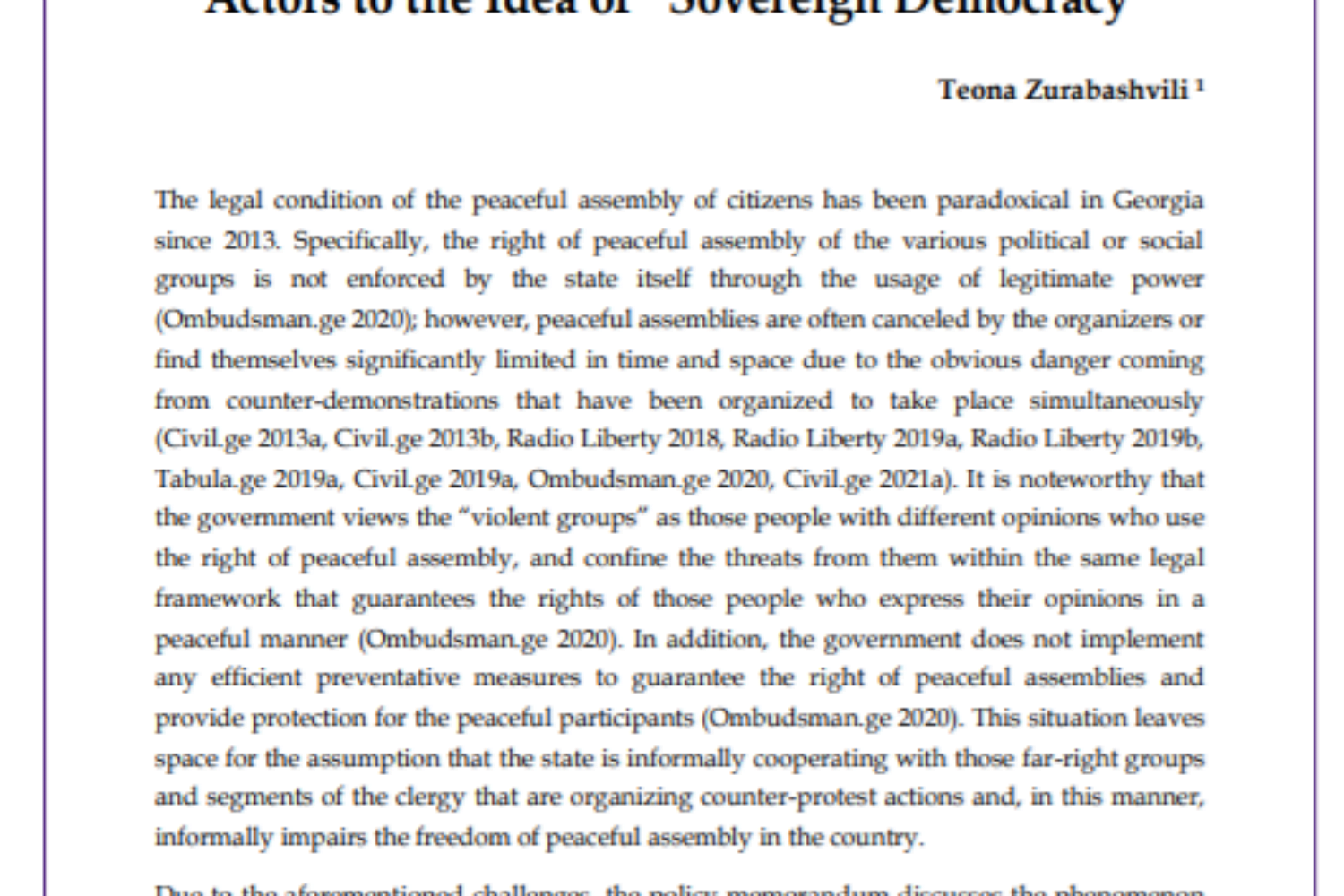 The legal condition of the peaceful assembly of citizens has been paradoxical in Georgia since 2013. Specifically, the right of peaceful assembly of the various political or social groups is not enforced by the state itself through the usage of legitimate power (Ombudsman.ge 2020); however, peaceful assemblies are often canceled by the organizers or find themselves significantly limited in time and space due to the obvious danger coming from counter-demonstrations that have been organized to take place simultaneously (Civil.ge 2013a, Civil.ge 2013b, Radio Liberty 2018, Radio Liberty 2019a, Radio Liberty 2019b, Tabula.ge 2019a, Civil.ge 2019a, Ombudsman.ge 2020, Civil.ge 2021a).