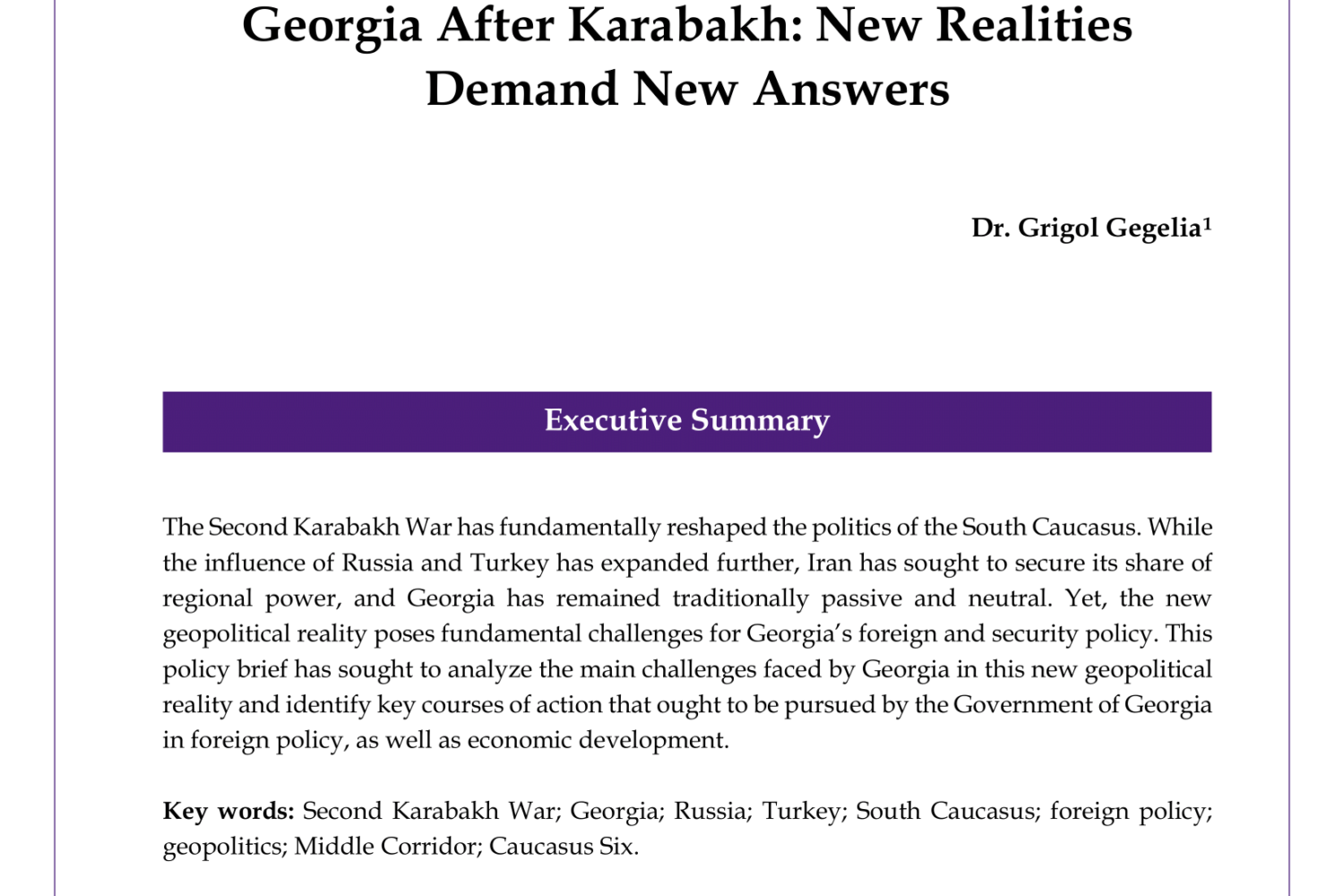 The Second Karabakh War has fundamentally reshaped the politics of the South Caucasus. While the influence of Russia and Turkey has expanded further, Iran has sought to secure its share of regional power, and Georgia has remained traditionally passive and neutral. Yet, the new geopolitical reality poses fundamental challenges for Georgia’s foreign and security policy. This policy brief has sought to analyze the main challenges faced by Georgia in this new geopolitical reality and identify key courses of action that ought to be pursued by the Government of Georgia in foreign policy, as well as economic development.